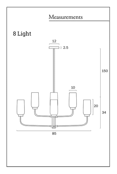 - The 8 light variant has a fixture diameter of 850mm.