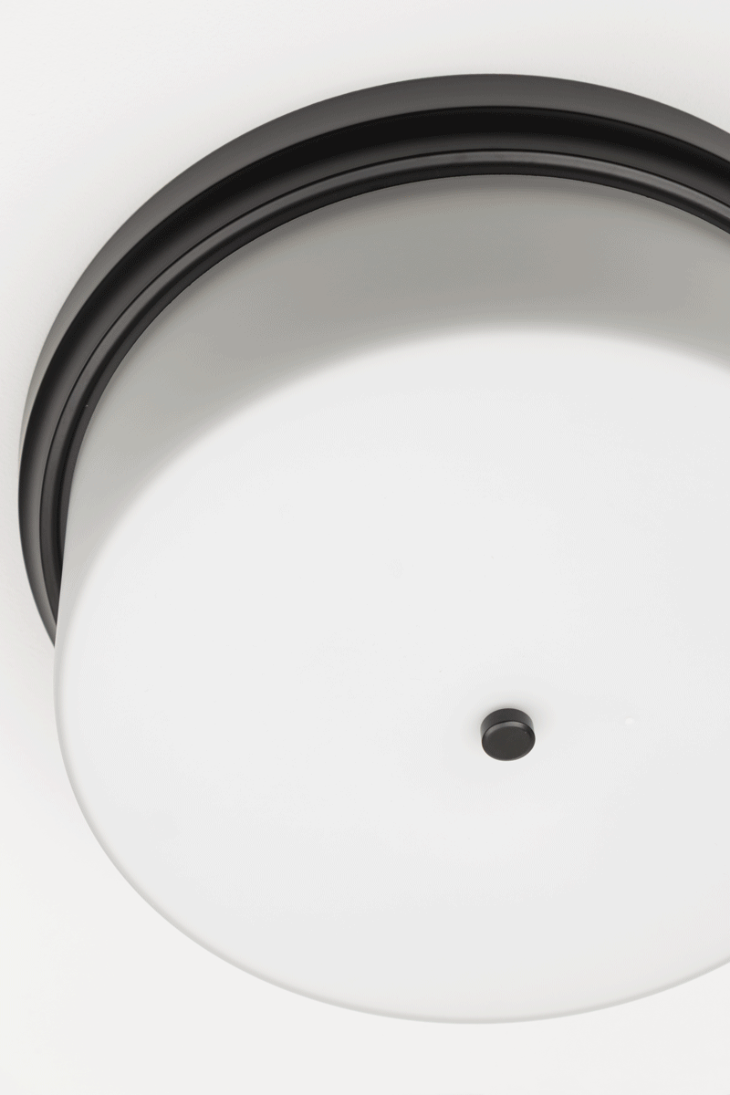 The Bowral Glass Ceiling Light exemplifies transitional design, making it a versatile addition to any decor. Its large opal glass shade is complemented by black steel hardware. This close-to-ceiling fixture making it perfect for small spaces like entryways, or ideal for low ceilings in kitchens, living rooms, and bedrooms.