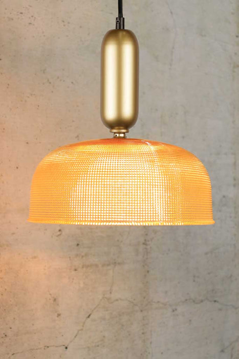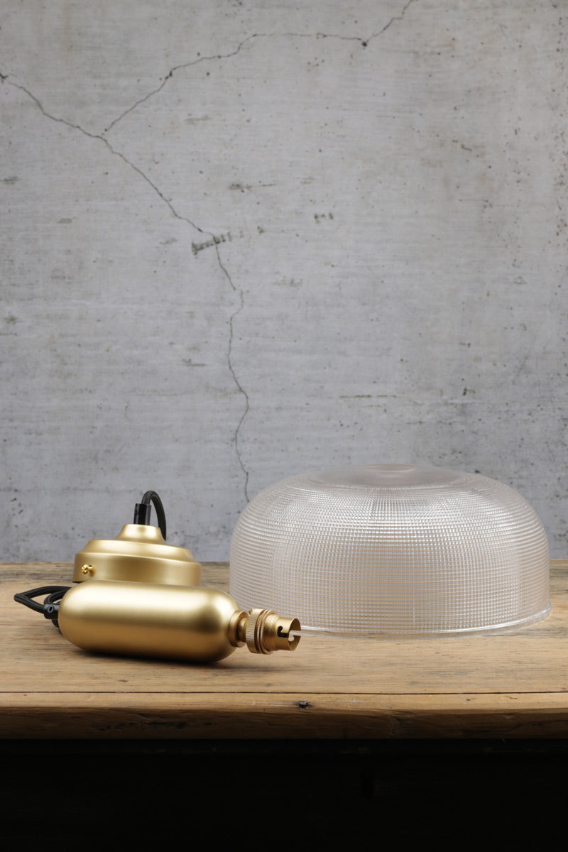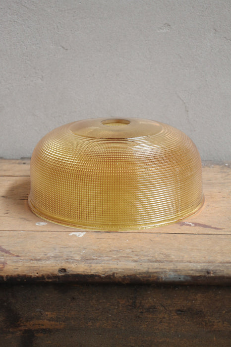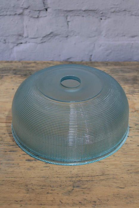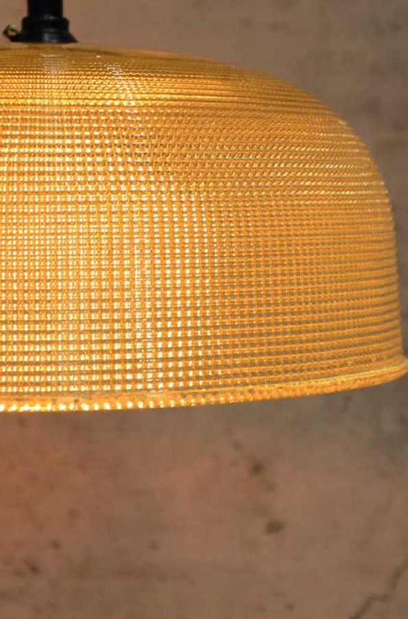 - Glass shade features a holophane glass design with crosshatch pattern.