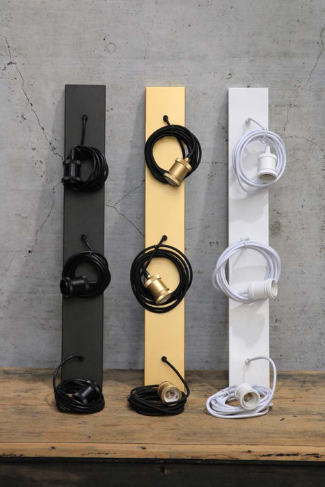 - The metal ceiling rose comes in black, gold/brass and white finish. The gold/brass fitting comes with black cords and gold lampholders, while the white fitting features white cords and white lampholders.