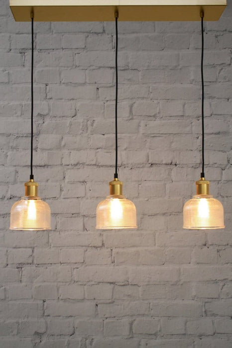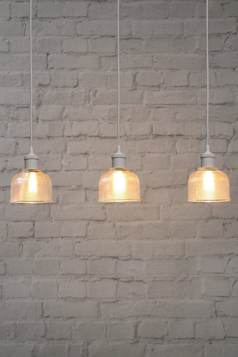 This 3 drop multi light is the perfect vintage inspired pendant to hang in your dining room or bedroom. It features three clear glass shades with a crosshatch design similar to the holophane glass style popular in the early 1900s. Their ability to softly diffuse light make this pendant light perfect for rooms that need mood lighting. A choice of three fitting finishes allows you to easily complement your decor and the pendant cord lengths can be altered to create varying styles. Available only at Fat Shack Vintage!