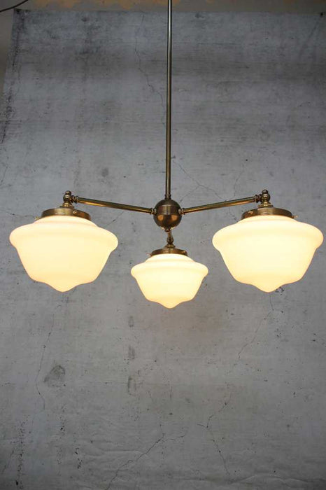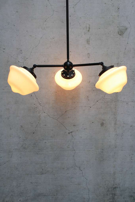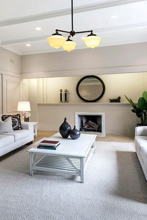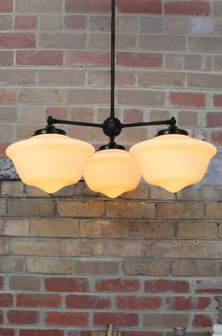 Add a glamorous statement to your home or commercial space with the Chelsea Schoolhouse Chandelier. A modern take on a traditional lighting style, this light has been constructed in steel with two finishes to choose from. The steel frames feature adjustable arms using wingnut screws on the ends for 180 degrees of vertical range for the shades. The shades have been created from handmade milky opal glass and are a testament to timeless design. Ideal for dining rooms, bedrooms and restaurant fit outs.