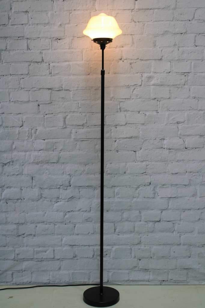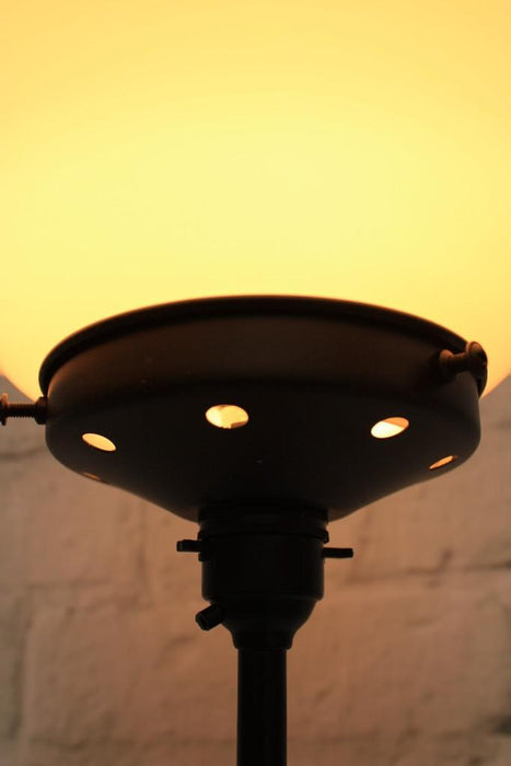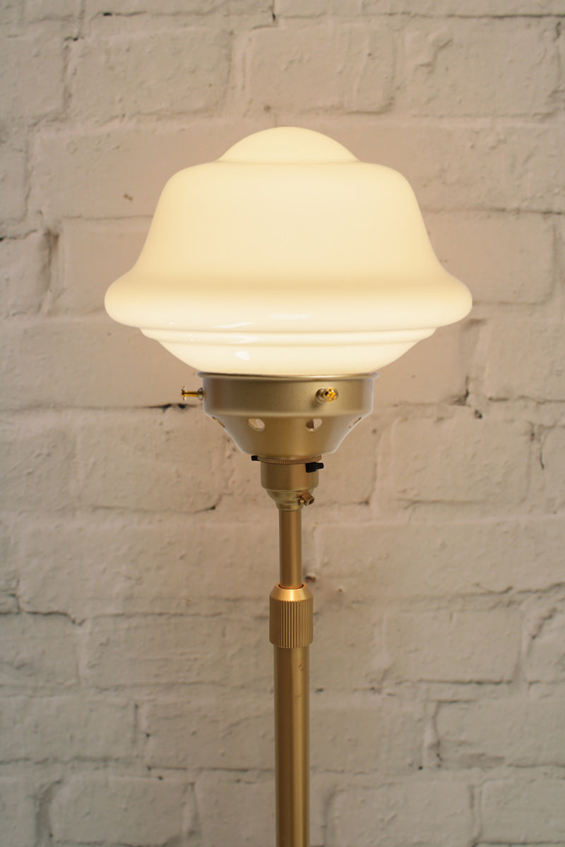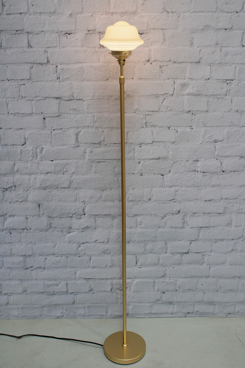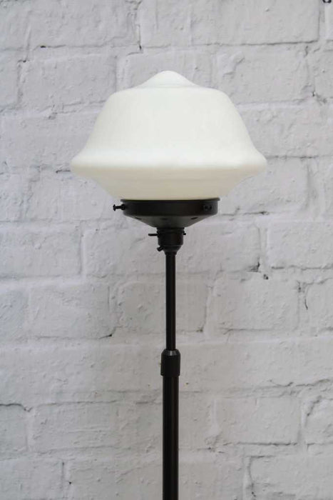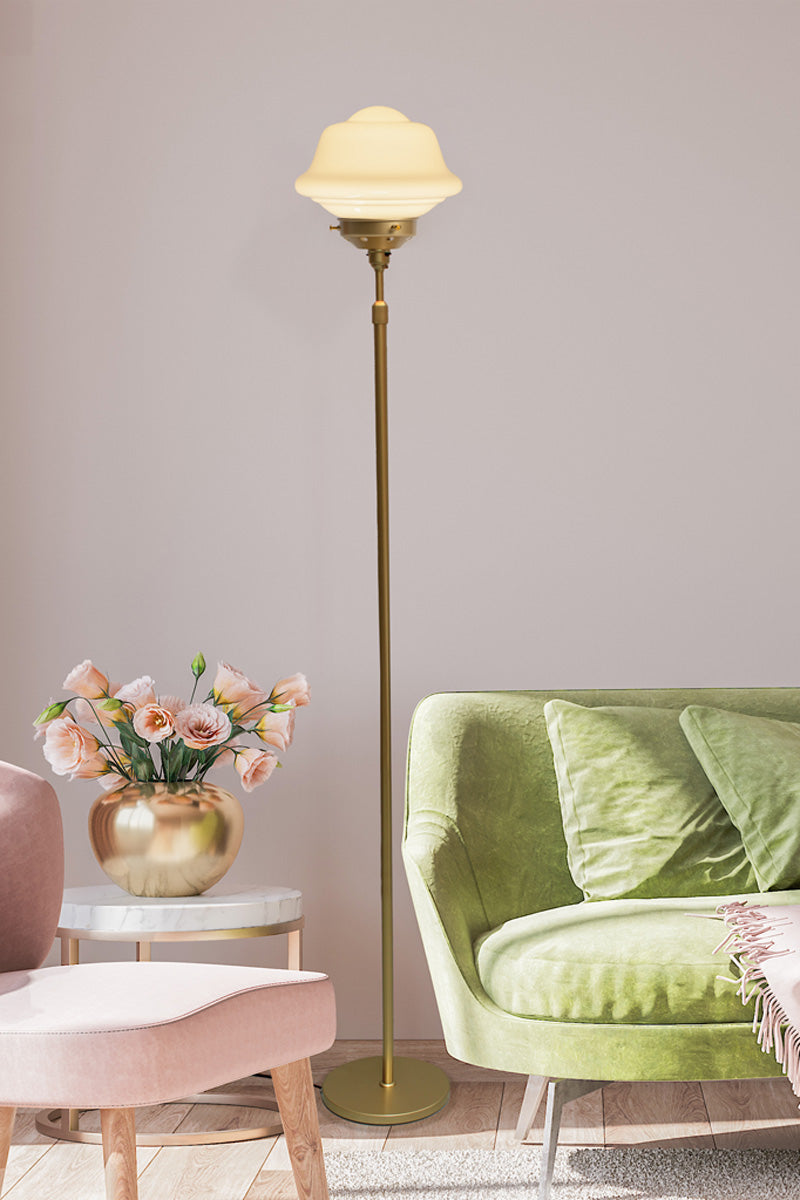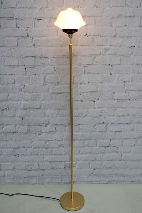 Give your interior a classic vintage flair with the Chelsea Glass Floor Lamp. This lamp features a distinctive handmade glass shade in an opal finish, highlighted by your choice of a black or gold/brass finished lamp base. The narrow base allows this lamp to fit into a multitude of spaces and is weighted for stability.