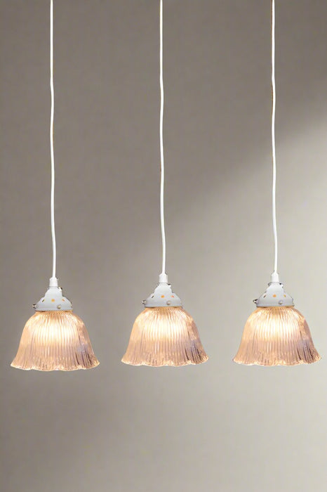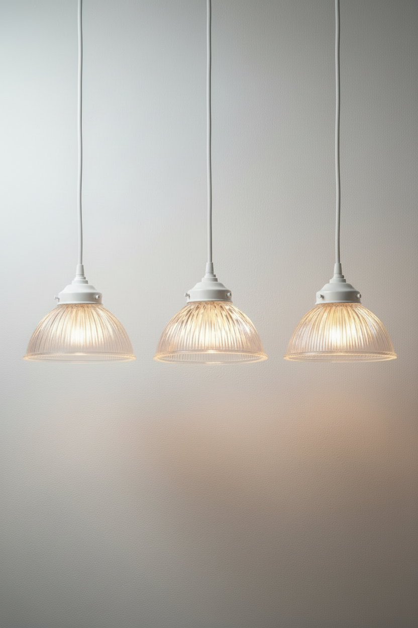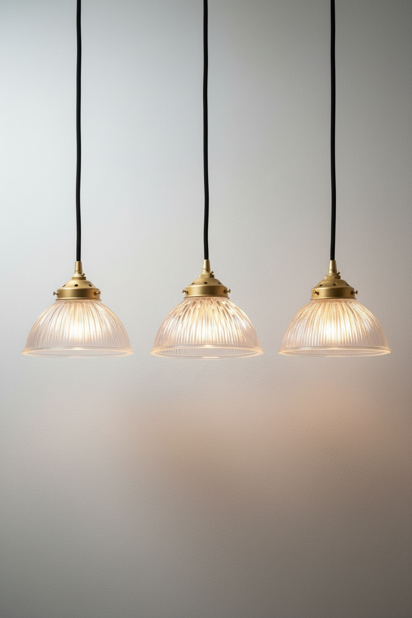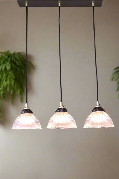 Recreate the vintage charm of the 1900s with the Como Multi Light Pendant. Its three holophane glass shades, available in amber or clear, feature a ribbed finish that softly diffuses light to create an elegant lighting feature. Accented with metal fittings in a choice of three finishes, this statement light offers an elegant centrepiece ideal for your dining space, kitchen or commercial fit out.