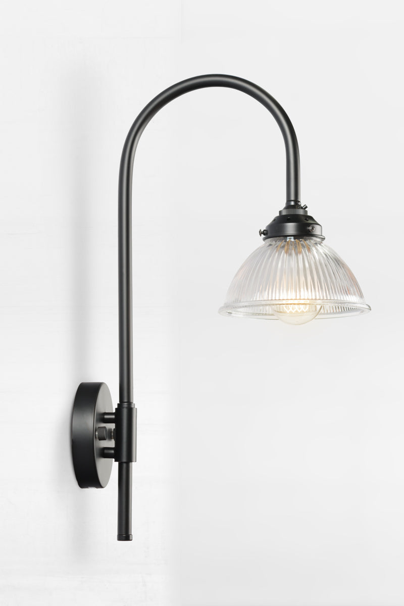The Como Shepherd Hook Swivel Arm Wall Light is a modern take on the classic wall light. It features a steel wall sconce with swivel capabilities paired with a ribbed glass shade in a clear or amber finish to enhance its classic flair. Add functional and modern aesthetic style to enhance your space. Perfect for task lighting or adding a touch of sophistication to any room.