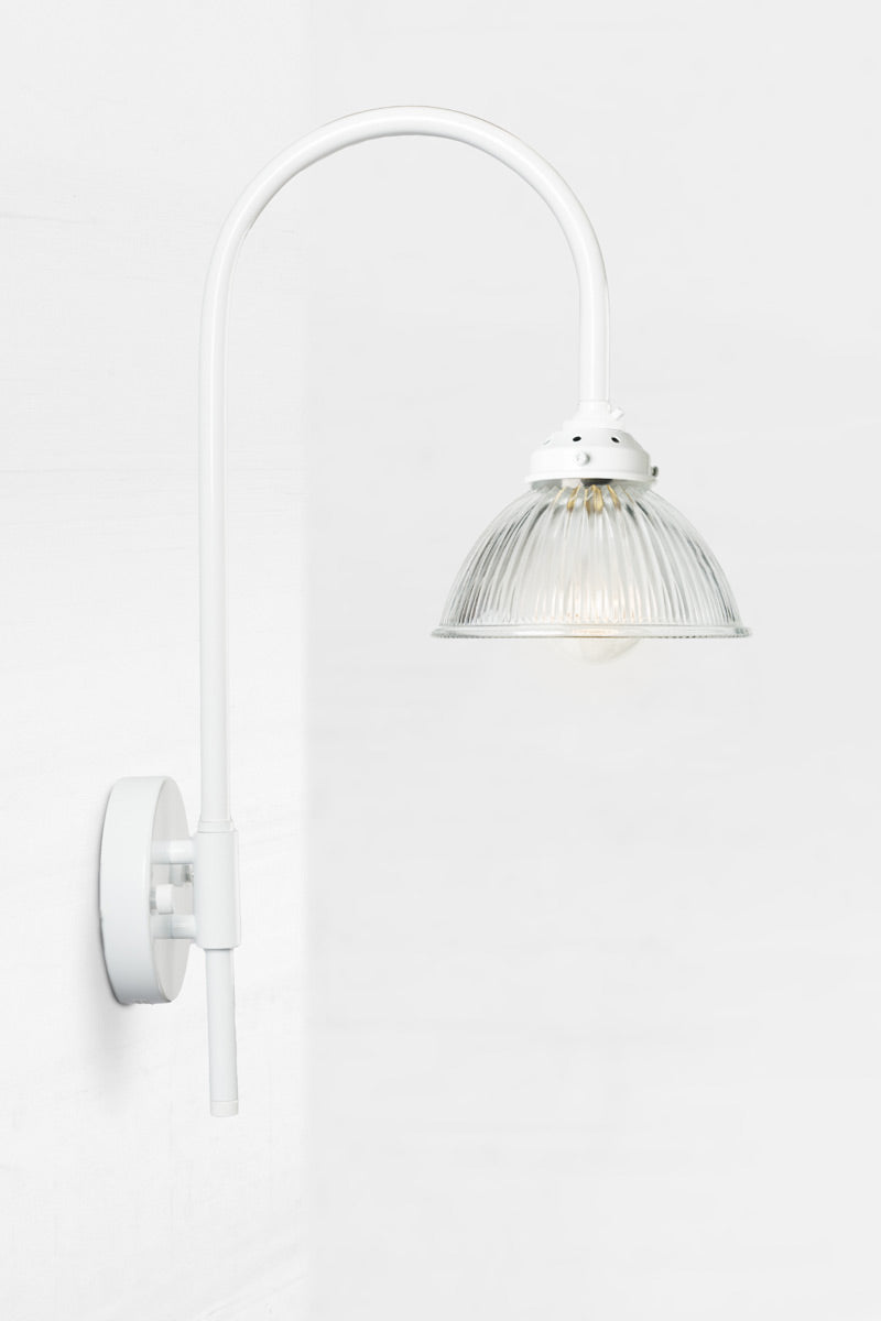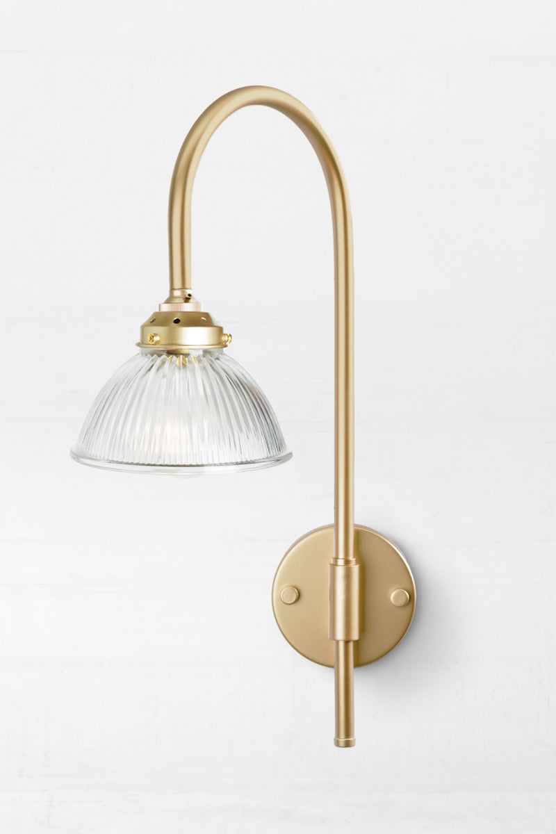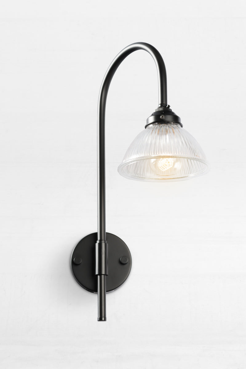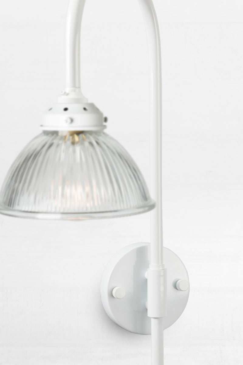 - This wall lamp features a clear Holophane glass shade that comes in a clear or amber finish.
