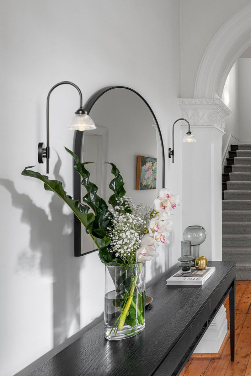 - The glass shade is fitted to the arm with a gallery. All finishes are paired with a matching gallery.