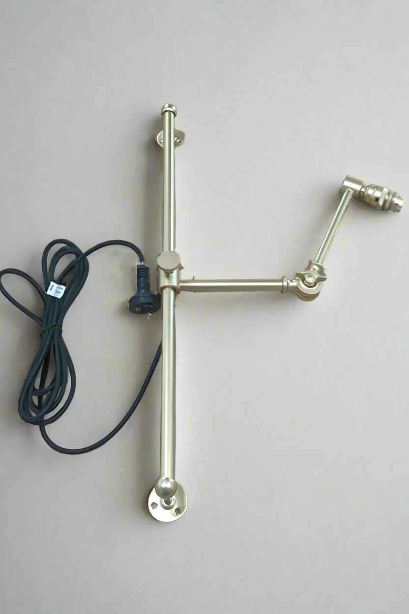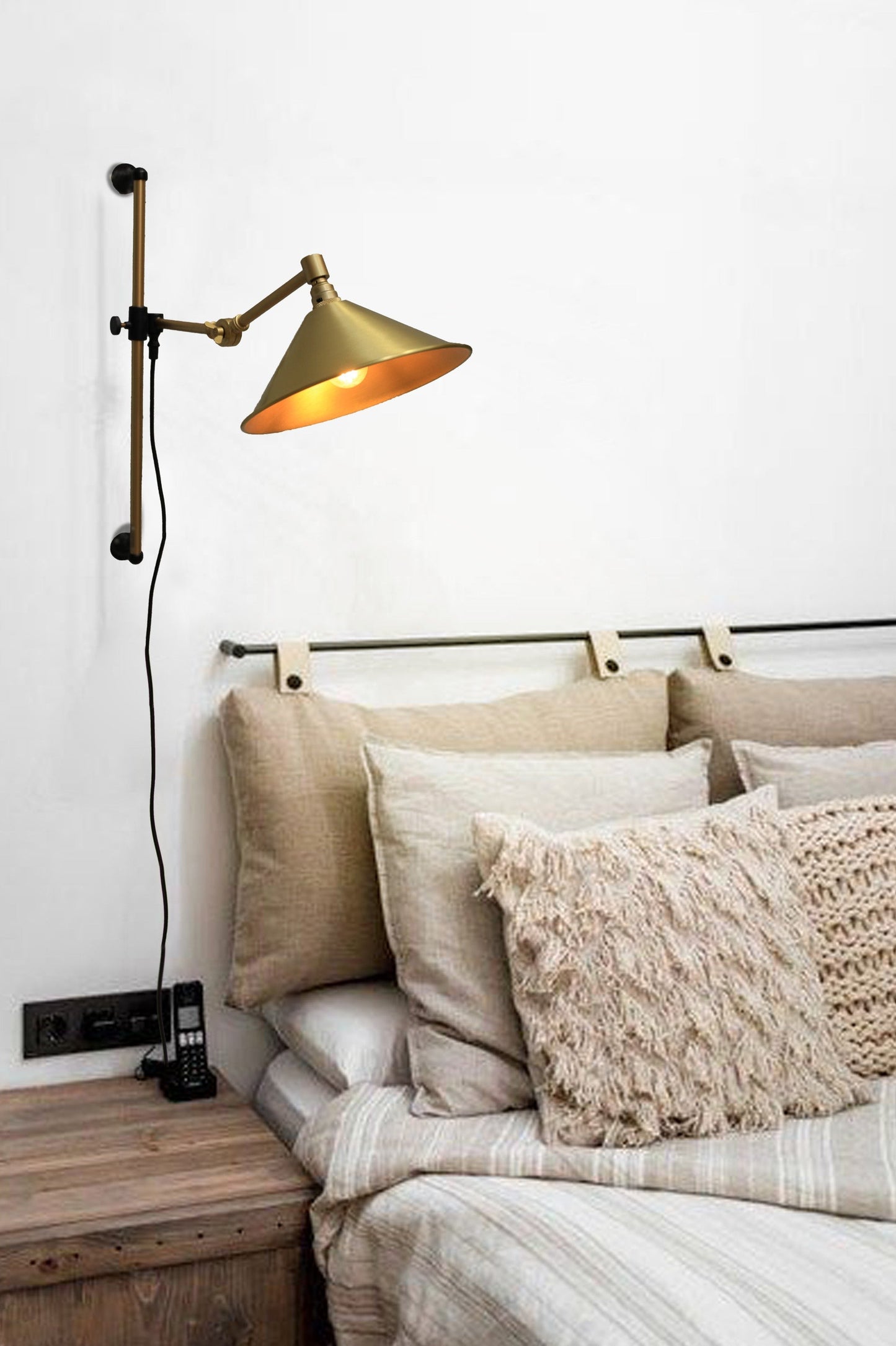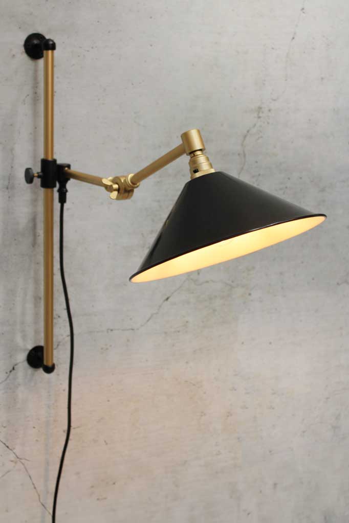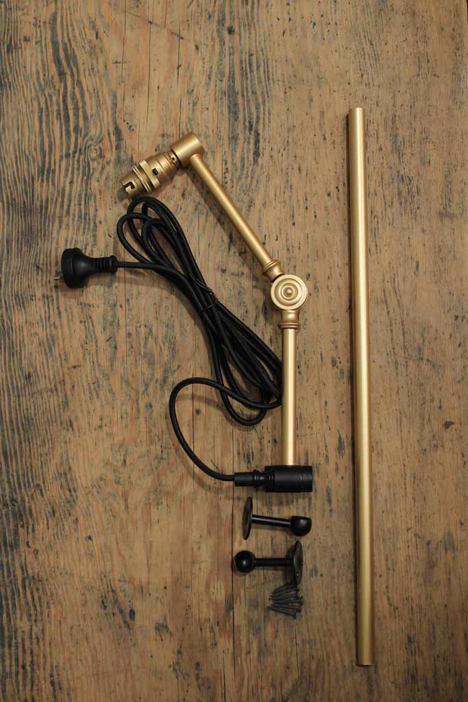- The swing arm has a wall plug in a choice of matt black or gold/brass finish.