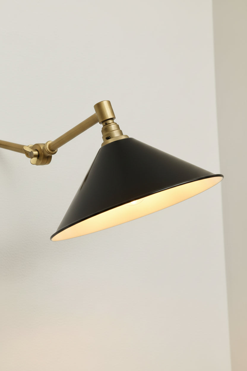 The Cone Swing Arm Wall Lamp is a versatile and stylish choice for any contemporary setting. It's conical shade is are a classic design that has been popular since the mid 20th century. The shade is suspended from a swing arm wall mount. The practicality of this light means that it can be used for a variety of purposes from illuminating over a bedside table, in an office/study or reading nook.