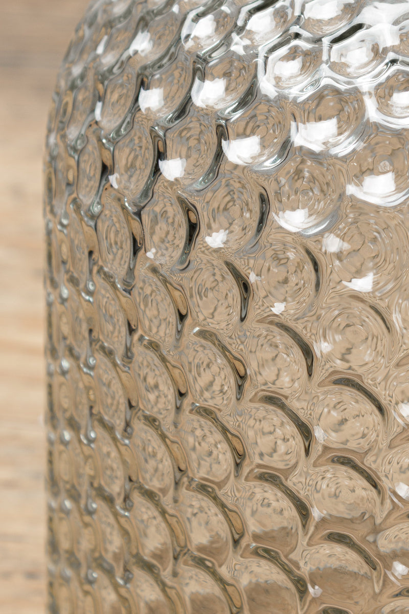 - The glass shade offers a distinctive tessellated texture and design.