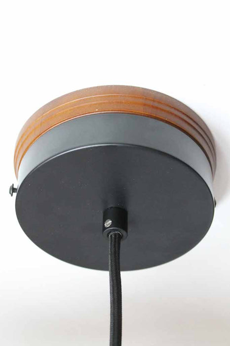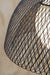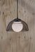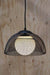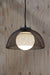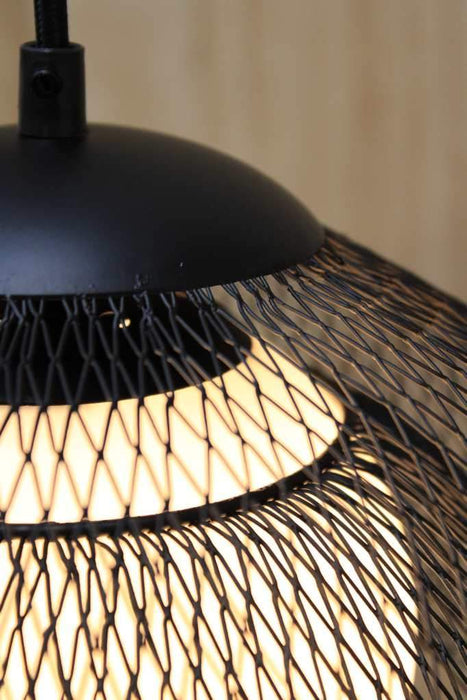- This pendant is comprised of a cross-hatched steel shade, opaque glass orb, suspended by a black fabric cord with black fixtures.