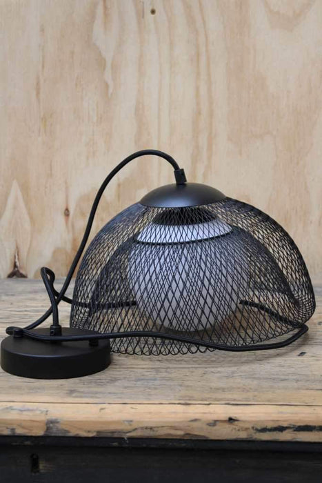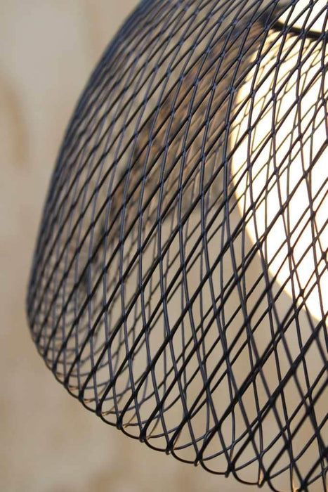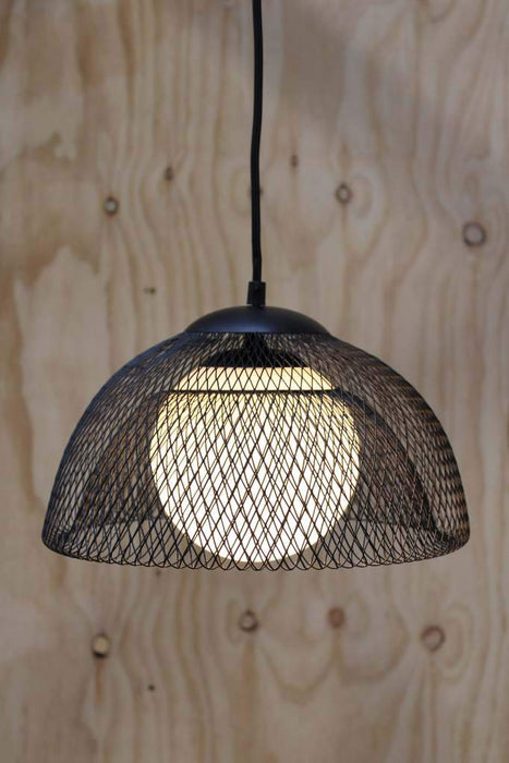 The Crosswork Glass Pendant Light has a subtle industrial look that will suit many interiors. A cross-hatched steel shade sits over an opaque glass orb, suspended by a black fabric cord. Providing stylish diffuse light, this pendant would look ideal above a kitchen island or dining table, or in a hallway. Commercially, this light would suit an urban streetwear retailer, industrial-inspired brewery or modern restaurant.
