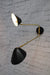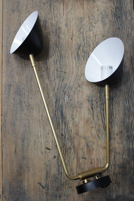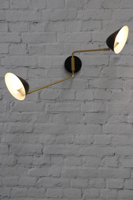 An inspired rendition of Serge Mouille lighting, the Dallas Tiltable Wall Light captures the pared down elegance and refined lines of the 1950s French design. Its two black shades take a distinctive form, and extend from long and short arms accented in brass finish. While the arms are mounted at two levels, the shorter arm is slightly more angled to provide more focused lighting. A range of movements involving the arms and shades capture a kinetic aesthetic to offer a highly functional and stylish addition to your breakfast nook, home office or cafe and restaurant interior.