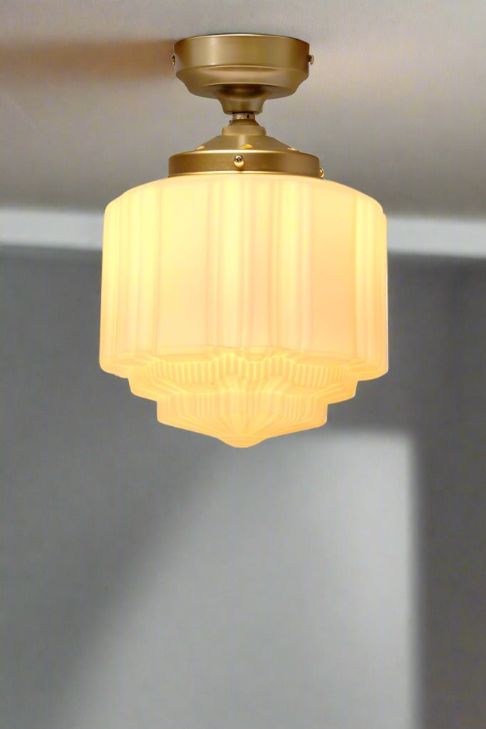 • This ceiling features an opal shade with art deco detailing.