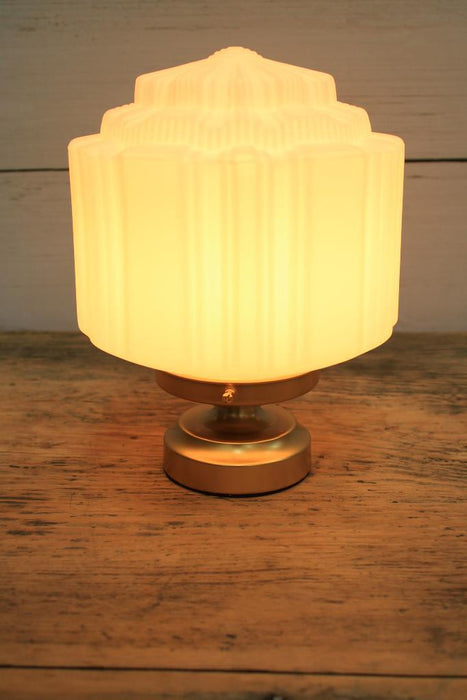 • This table lamp features an art deco style opal glass shade.