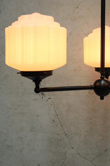 Add an unmistakable touch of Art Deco elegance to your home or business with the Deco Glass Chandelier. Crafted from pressed glass, the shades make a stunning lighting statement with sculpted lines and an opal finish. The opal shades are paired with three frame options made from steel with adjustable wingnuts with three or five arms. This is an ideal feature for cafes and restaurants, dining spaces or living rooms.