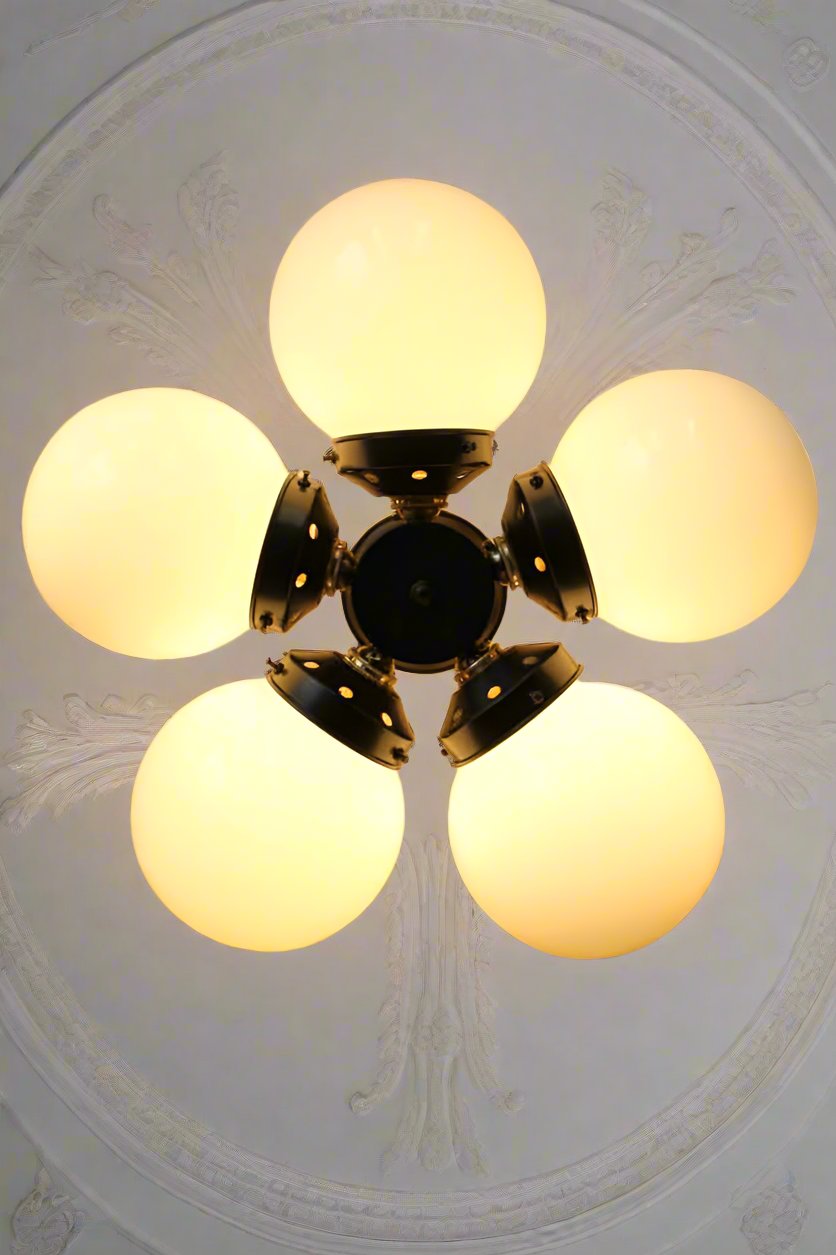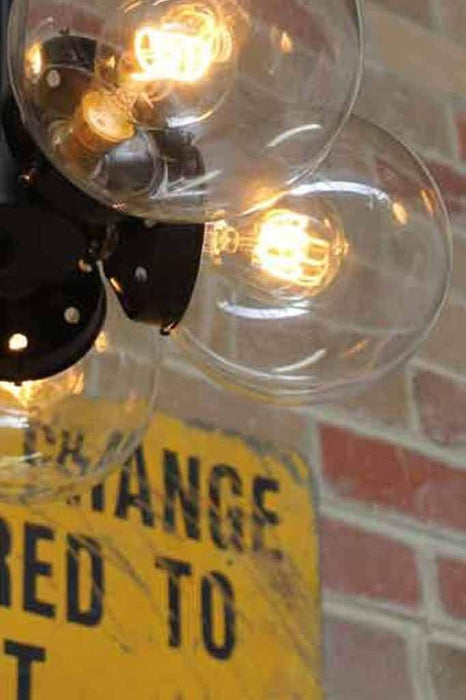 This Diner Flush Mount Light has a classic vintage feel with the hand blown milky glass shades, but a more modern look when using the clear glass ball shades. They have an inviting feel about them with their rounded lines and can be used in an array of interiors. Popular décor uses include accenting for kitchen lighting, in lounges, above dining tables, counter tops and foyers to name a few. Perfect for restaurant or café lighting looking to create that warm industrial look. Available only at Fat Shack Vintage!