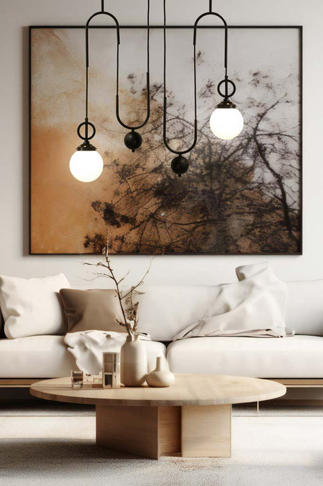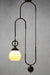 - The black cloth suspension cord is drawn through the arched metal frames and held in place by a weighted sphere.