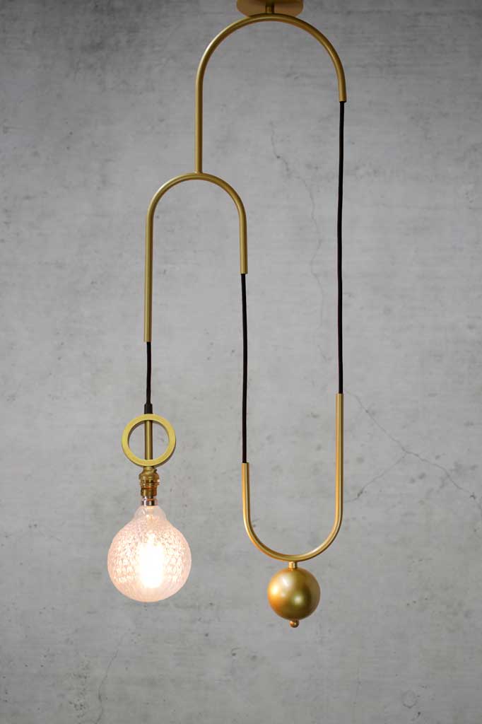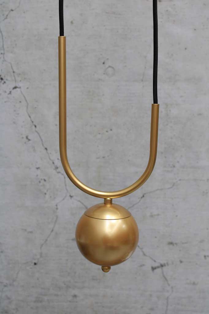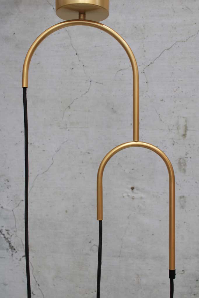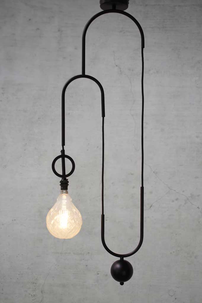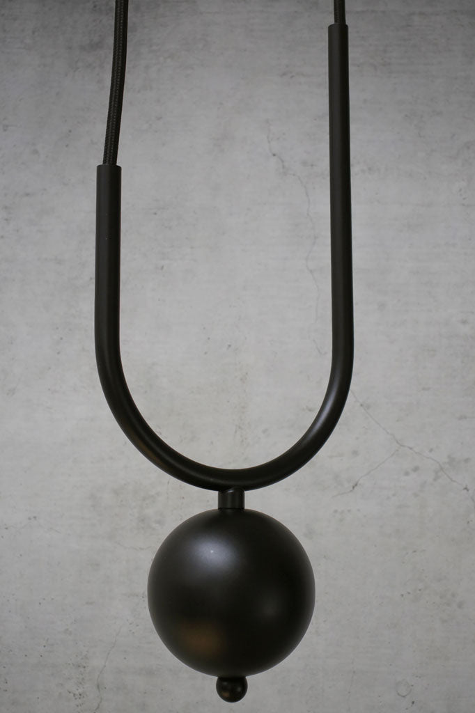- The black cloth suspension cord is drawn through the arched metal frames and held in place by a weighted sphere.