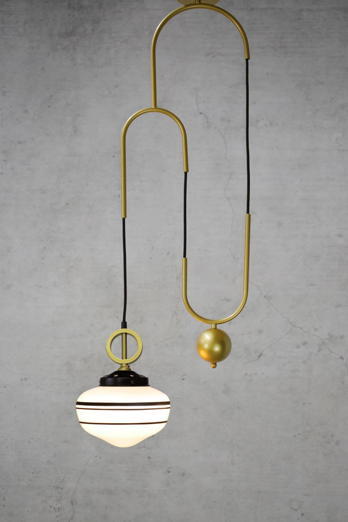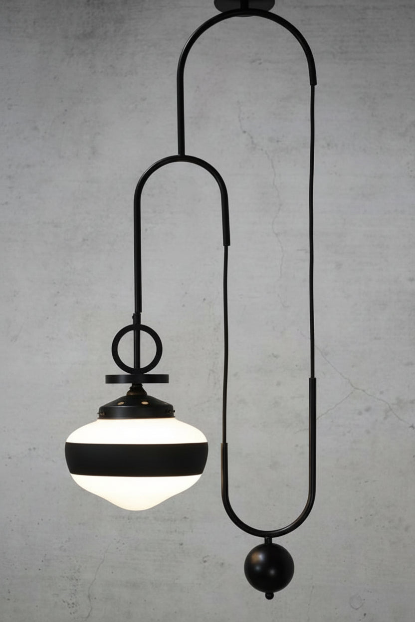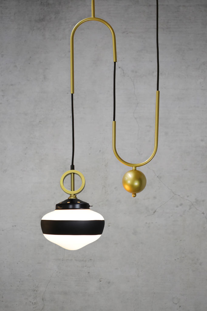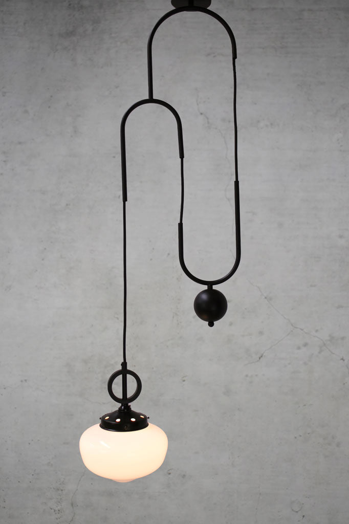 • The black cloth suspension cord is drawn through the arched metal frames and held in place by a weighted sphere.