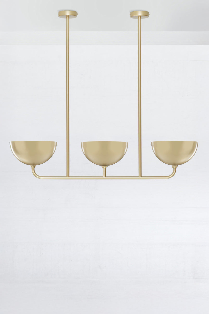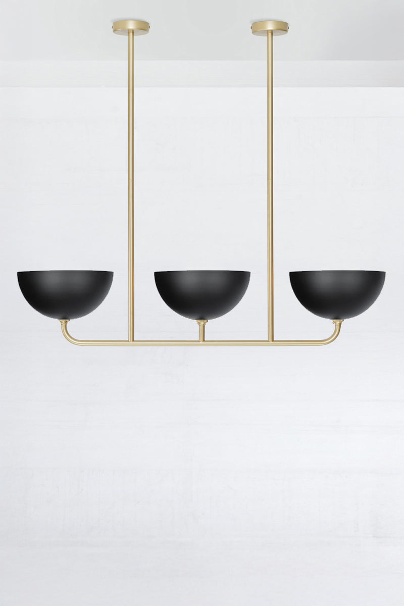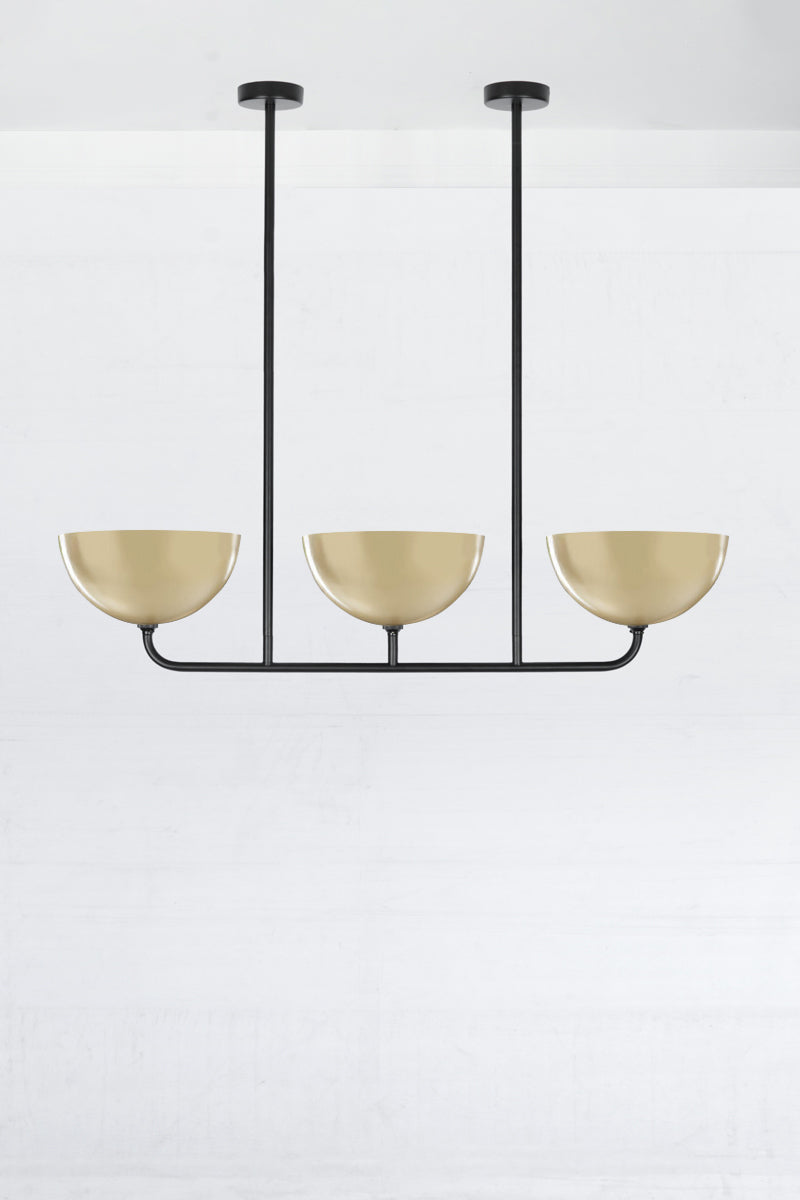 Elevate the ambiance in your home or commercial setting with the Dome Linear Chandelier. Featuring a striking design, this chandelier adds both boldness and practicality. It's linear design and clean curved frame in black or gold/brass, is fitted with three dome-shaped shades in two distinct finishes. This chandelier offers great illumination as well as the ability to create a warm and welcoming ambiance, making it the perfect addition to any room.