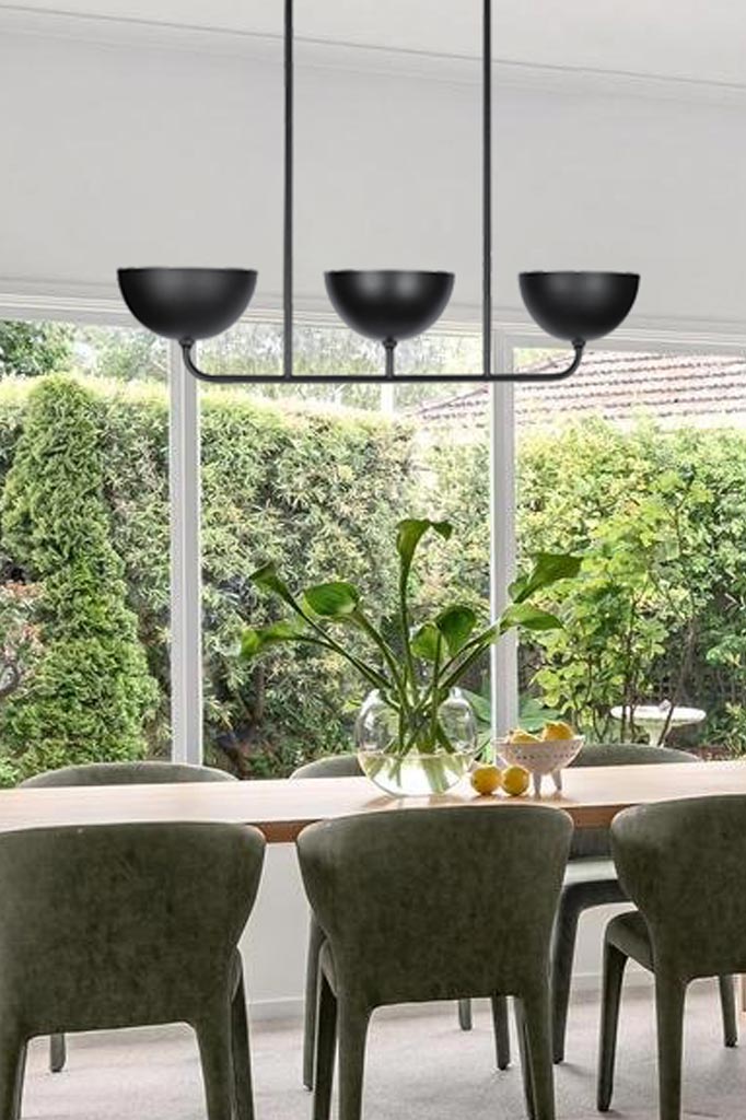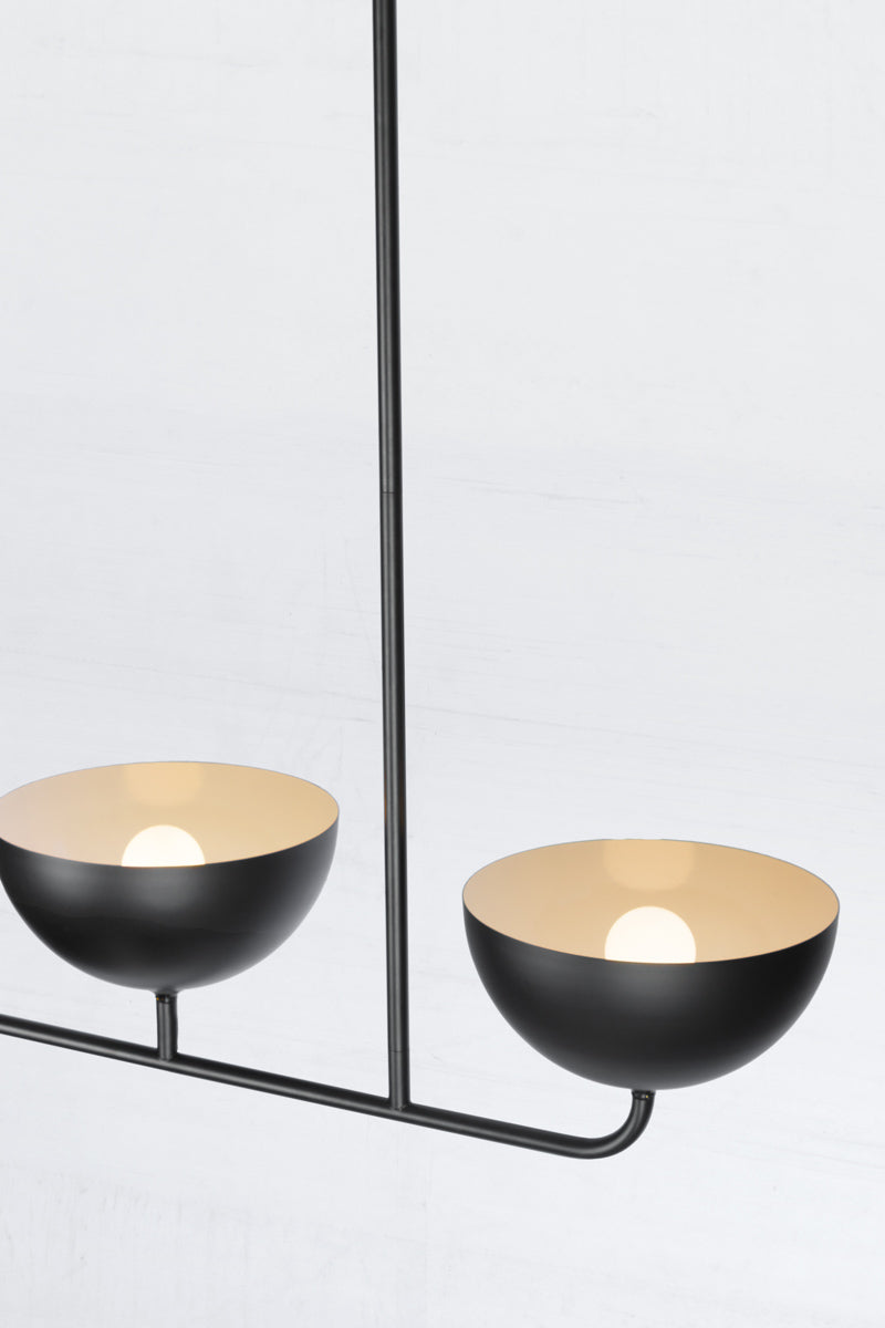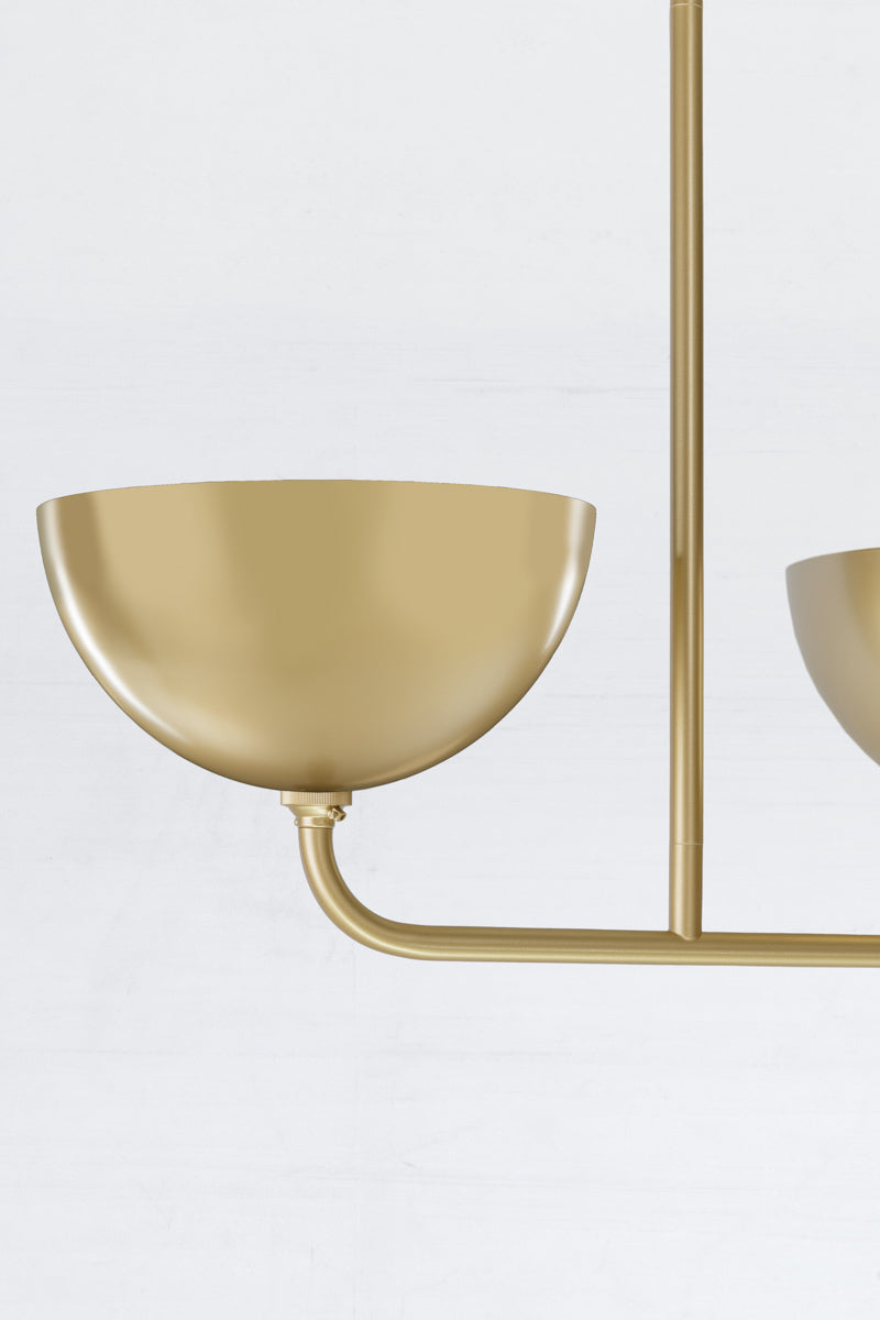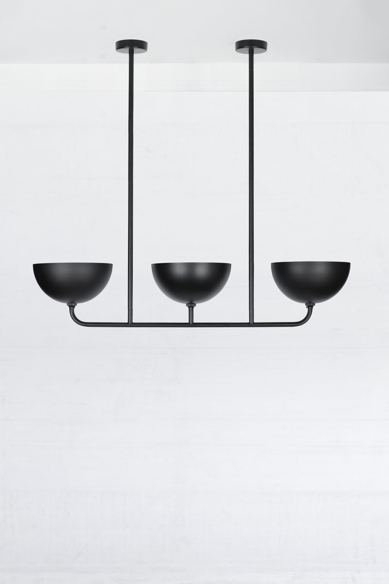 Elevate the ambiance in your home or commercial setting with the Dome Linear Chandelier. Featuring a striking design, this chandelier adds both boldness and practicality. It's linear design and clean curved frame in black or gold/brass, is fitted with three dome-shaped shades in two distinct finishes. This chandelier offers great illumination as well as the ability to create a warm and welcoming ambiance, making it the perfect addition to any room.