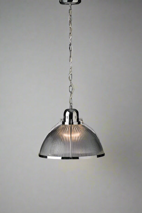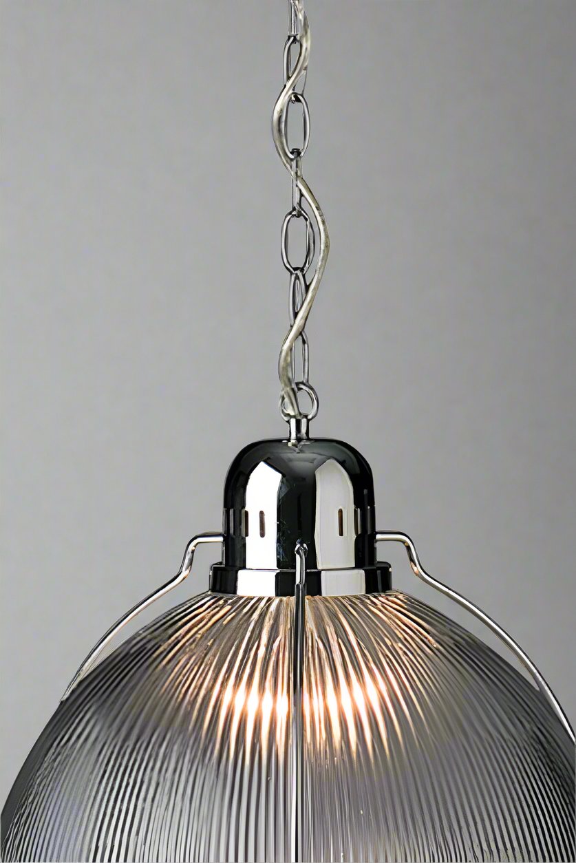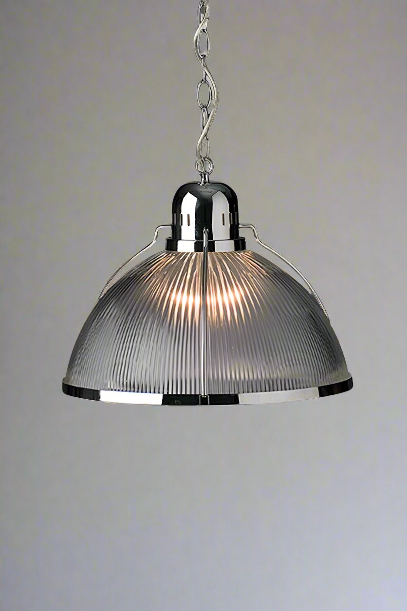 Add contemporary industrial style into your home or commercial space with the Durham Glass High Bay Light. Constructed from glass, this pendant light features a holophane style shade, and a modern chain/cord suspension. Finished in Bright Chrome, this bay light is ideal when used in triplicates above kitchen islands, above dining tables and in cafes.