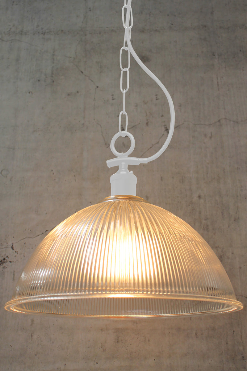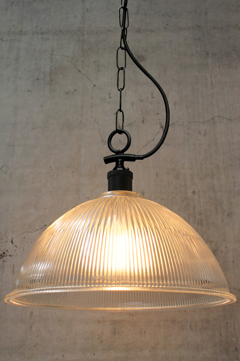 - Made from solid, heavy rippled glass, it has a side entry chain/suspension with no gallery.