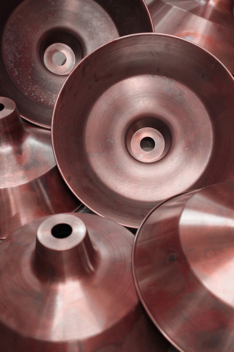 - The Aged Solid Brass/Copper shades have been fired for a deeper aged look. The Bright Brass/Copper shades have been mildly buffed on the outside to give them a brighter finish and then left raw. The inside is cleaned (not buffed) and then left raw. The shades are then oil rubbed to preserve the look for longer. Both finishes will continue to patina over time dependant on the environmental conditions they are placed in. The bright finish will patina at a slower rate because of the oil-rubbed finish.