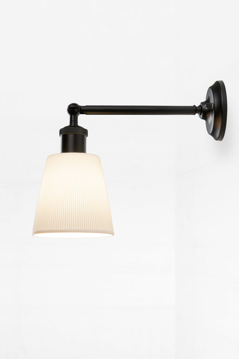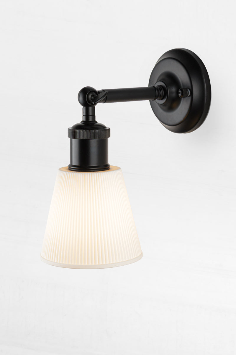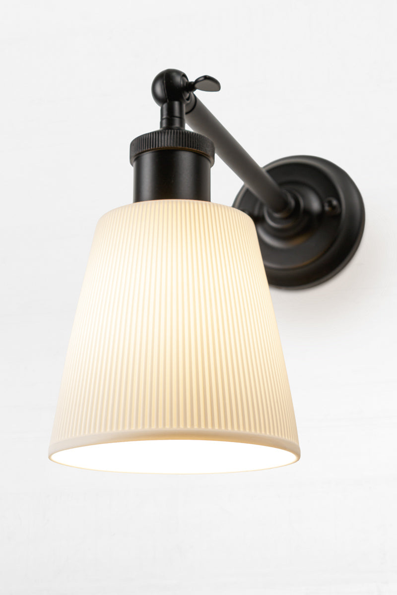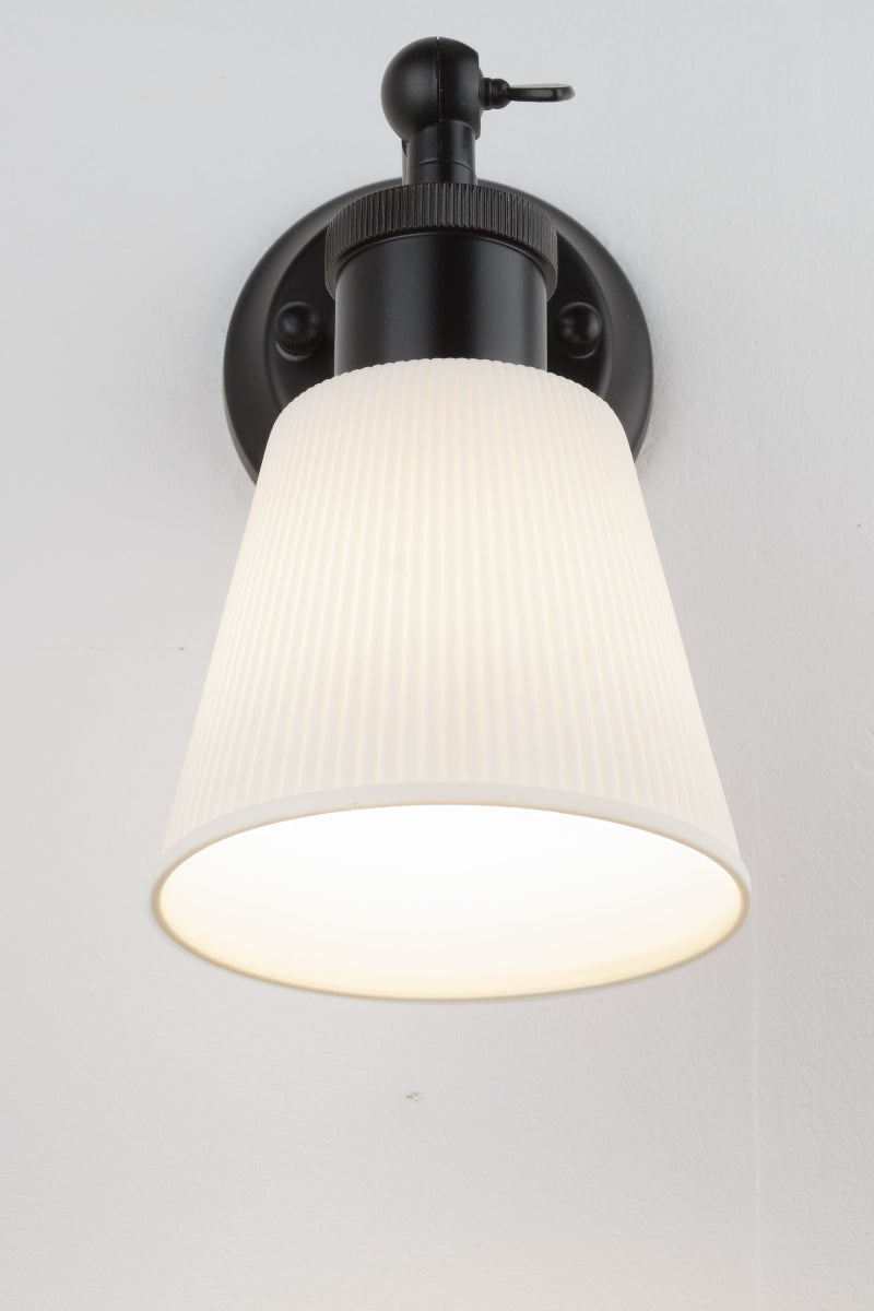 Adding instant refined charm is the Forli Ceramic Exterior Wall Light. Available in two sizes, the ceramic shade features an angular cone shape, decorated with thin ridges from top to bottom. The shade is made from unglazed white ceramic. It is partially translucent, allowing a warm glow to shine though the walls of the shade. Complement bathrooms to alfresco entertaining areas.