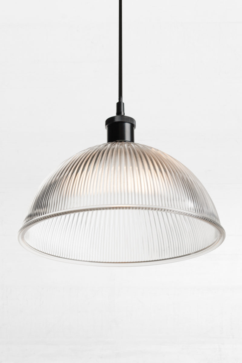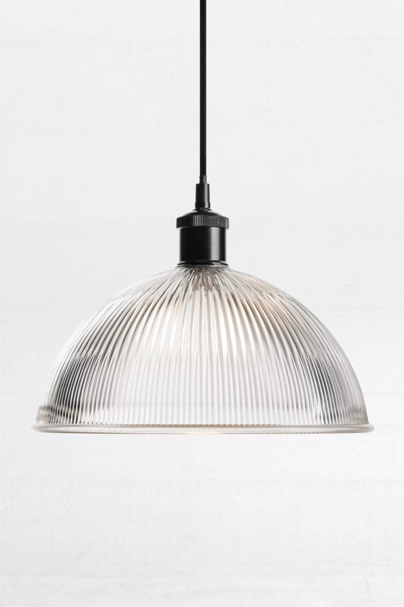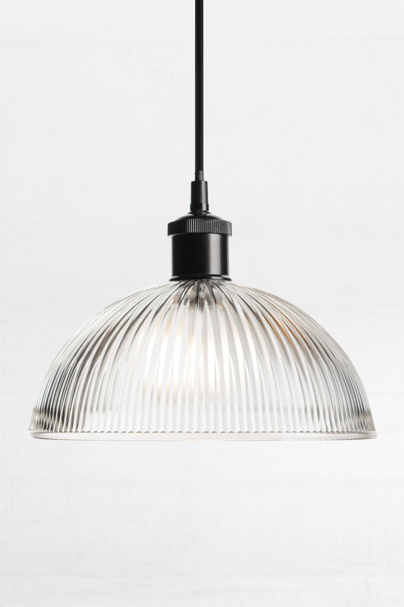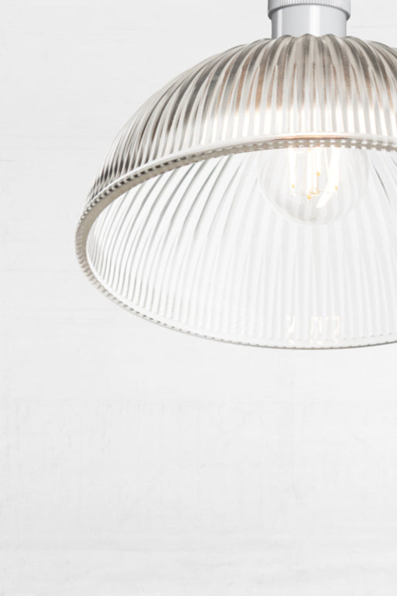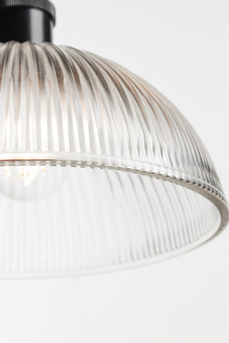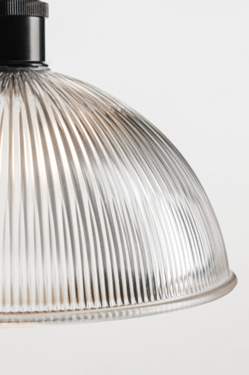 - The dome shaped glass shade has visible raised ridges running across its surface, creating a textured appearance.