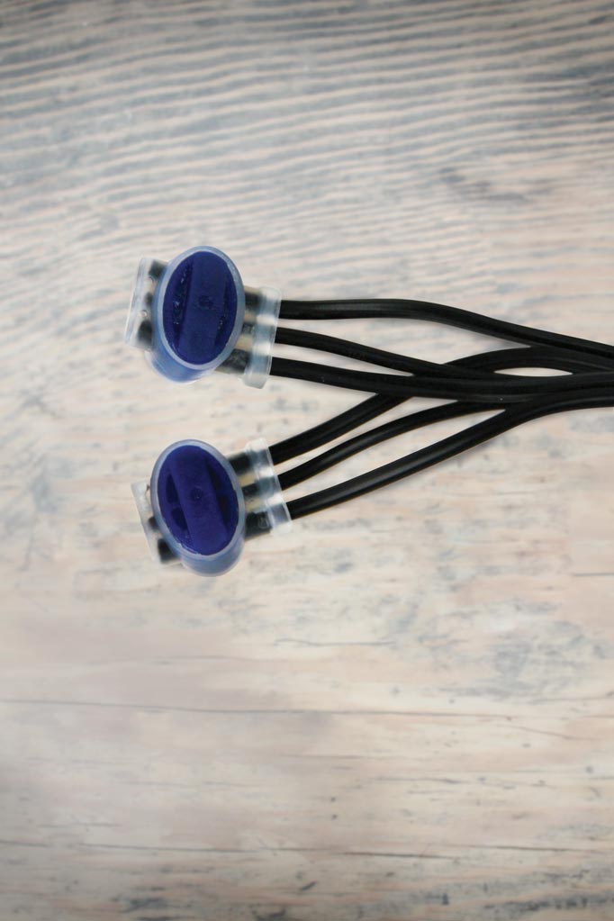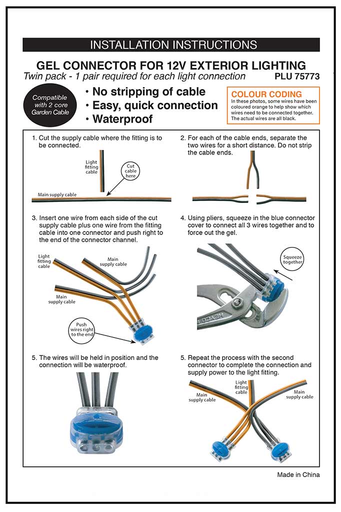 - The second image shows how the connectors are used to attach a light onto a 12v lighting circuit: the 12v cable is cut, one of each end is inserted into each gel connector, along with a wire from the light itself.