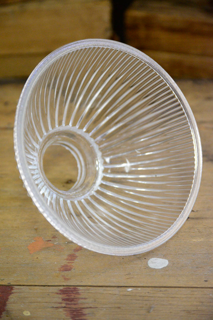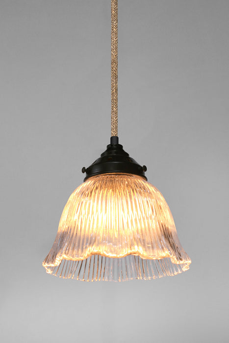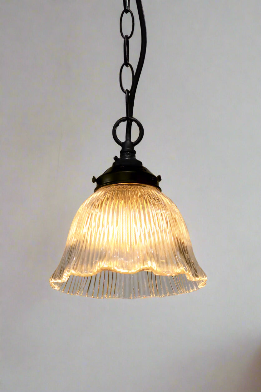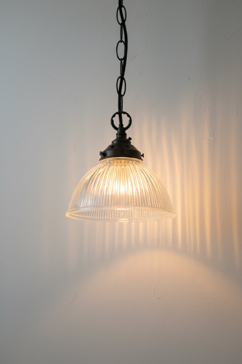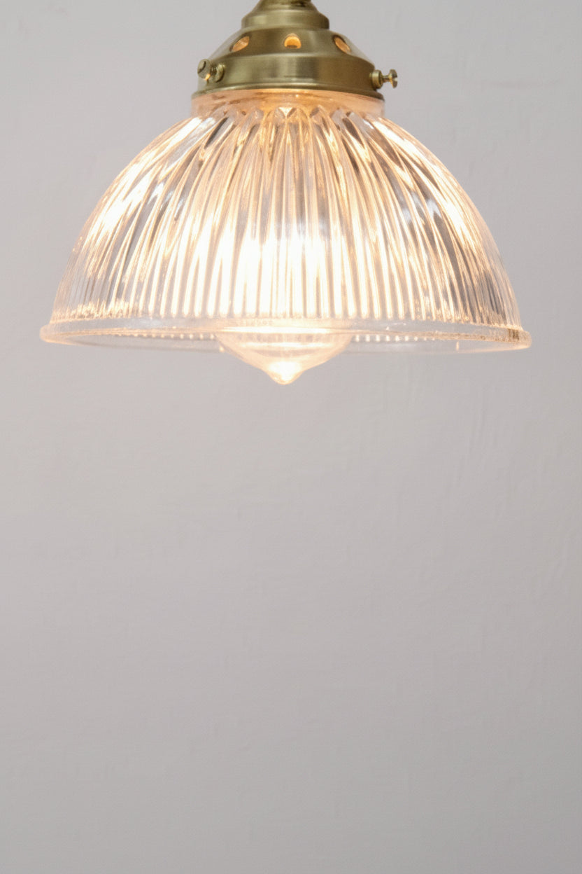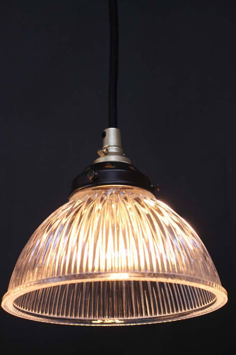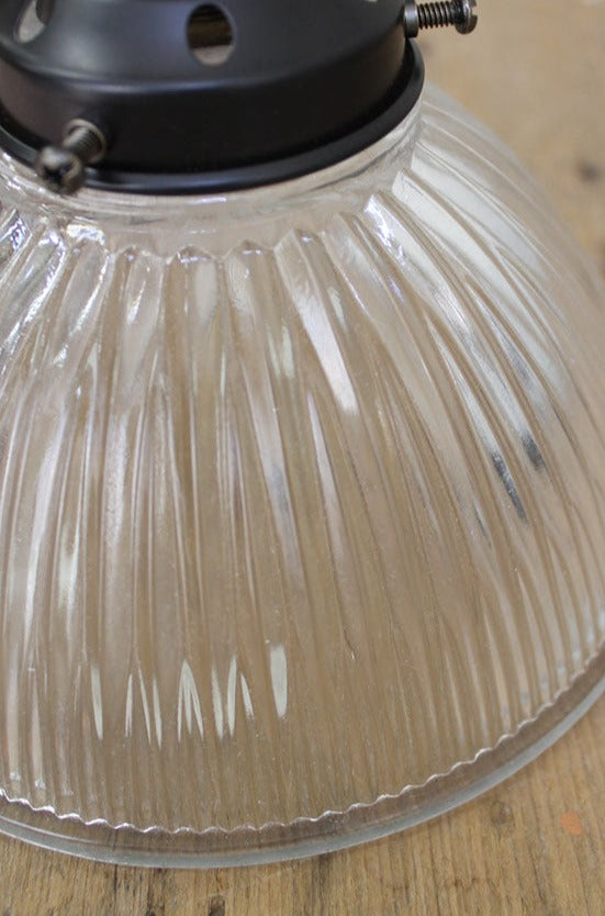 - This pendant light features a robust holophane glass shade with a ribbed finish.