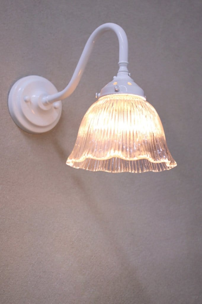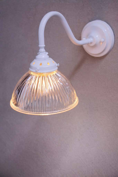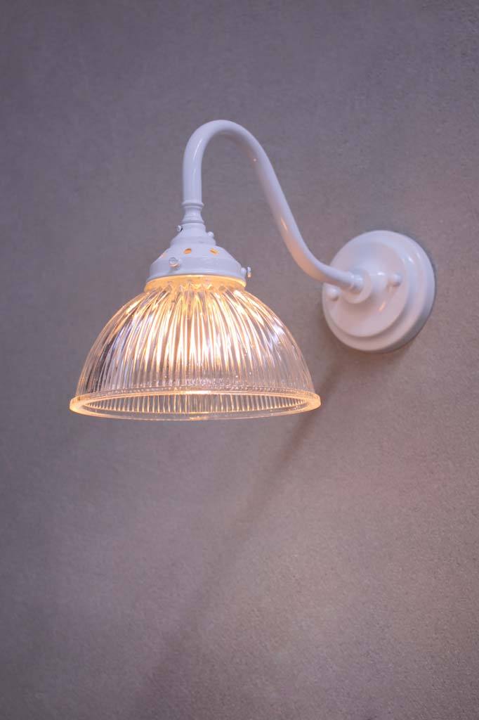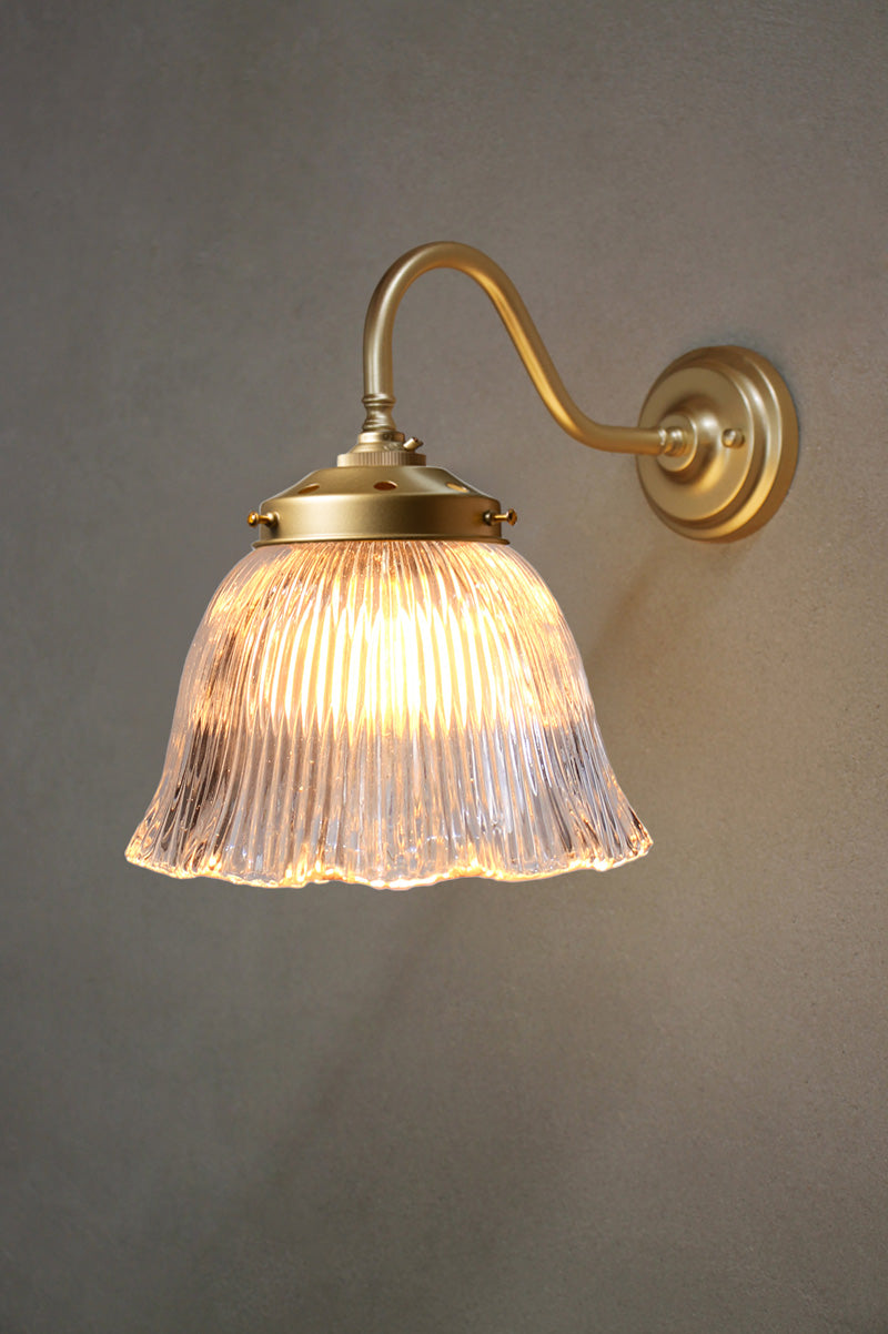 The Como Glass Gooseneck Wall Light is a delightful combination of vintage and industrial styles. The ribbed glass shade is reminiscent of the holophane glass designs made popular in the early 1900s and comes in two finish options. The wall sconce is handcrafted from brass or made of steel, available in a selection of finishes. This glass wall light is ideal for bedrooms, living rooms or hallways.
