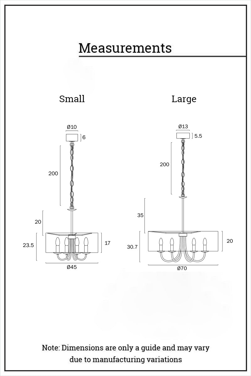 - The 4 light chandelier has a 200mm suspension pole attached to the chain, while the 6 light chandelier has a 307mm pole.
