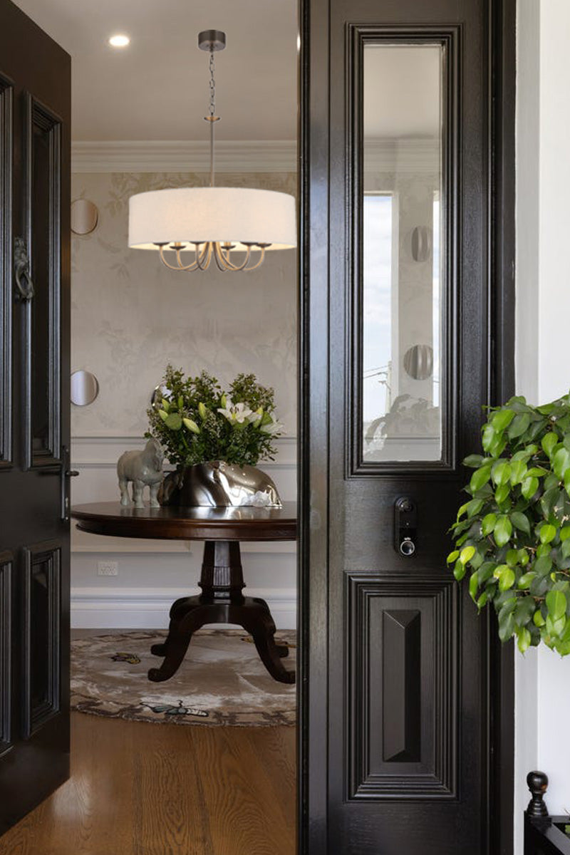 Experience a refined addition to any formal space with the Grenville Fabric Shade Chandelier. Its timeless drum shade features white fabric, complemented by your selection of a dark nickel or a satin brass finished frame. Available in small and large sizes, it provides ample illumination. Its design complements both contemporary and traditional interiors. Making it a sophisticated addition to a foyer, study or formal dining area.