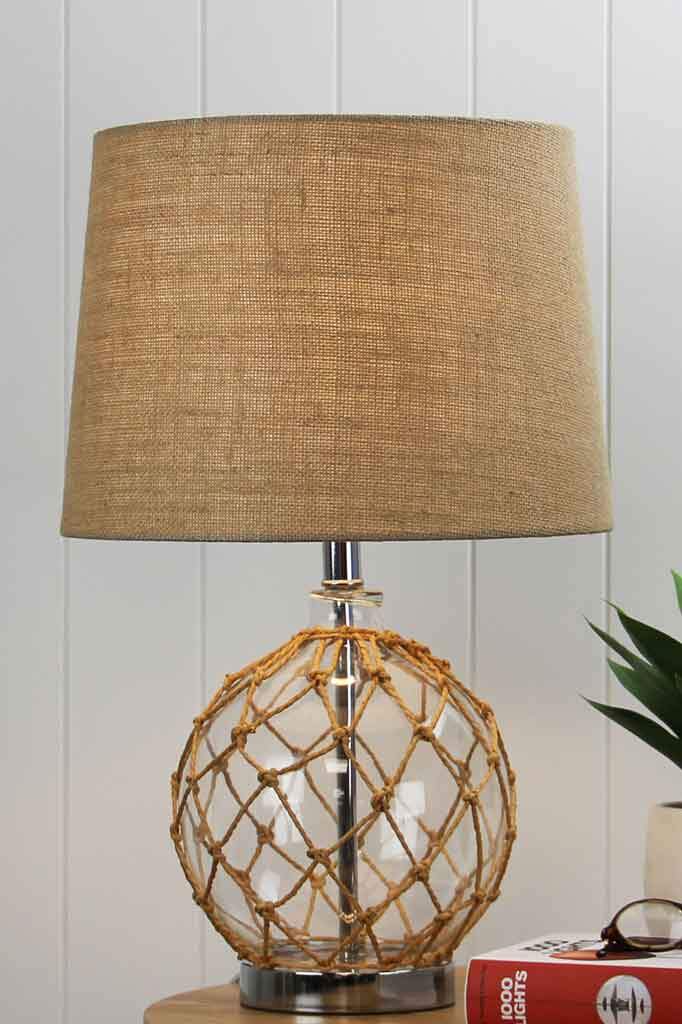 Full of character, the Hastings Rope Glass Lamp is the perfect statement piece for any beach side or Hamptons inspired home. The chrome base is topped with a round glass body, covered in a natural fibre netting and finished with a large hessian, tapered shade. Perfect for anyone looking for a sea change, this glass table lamp will create a relaxing beach vibe in any house or apartment space. Commercially it would suit beachside hotels, coastal retail boutiques or a relaxing day spa.
