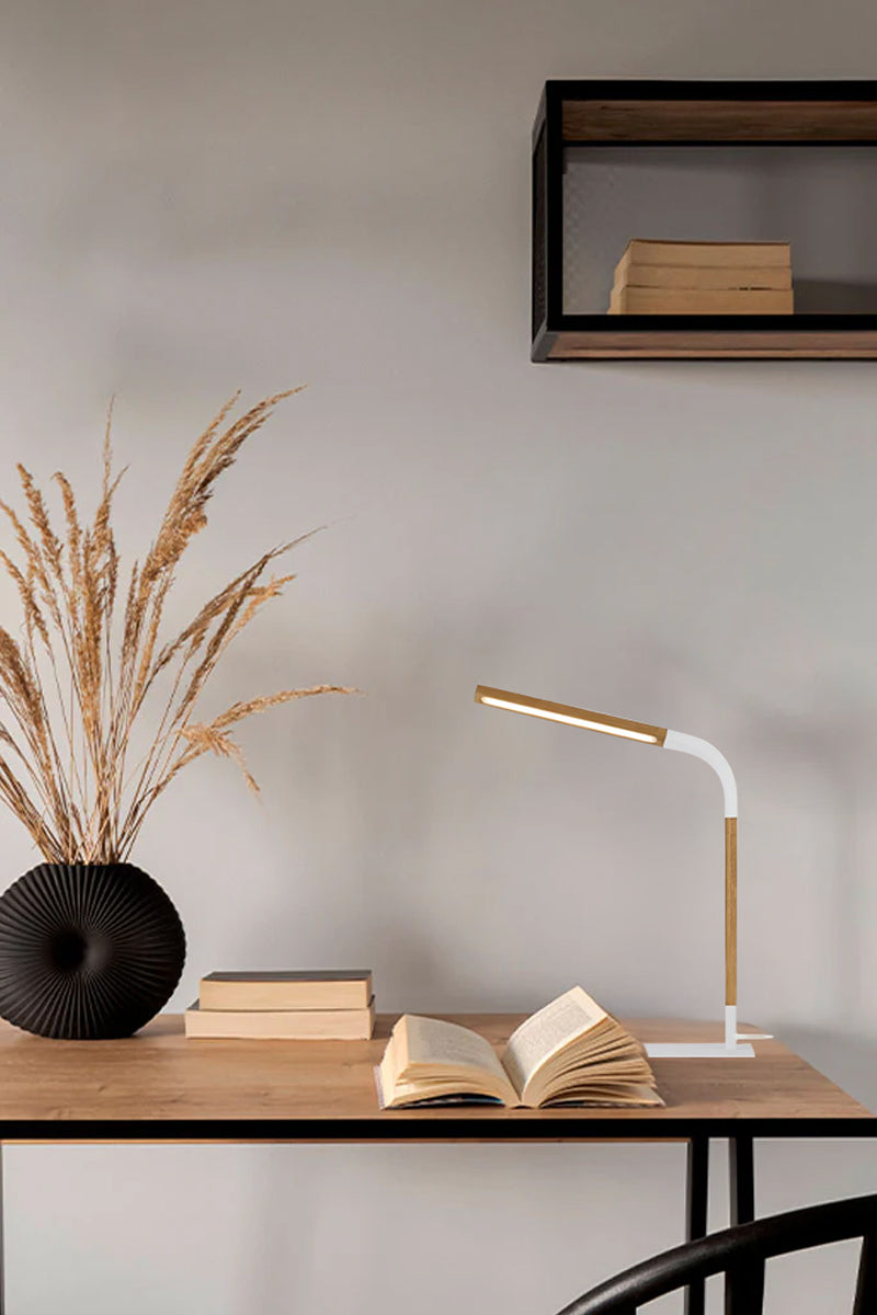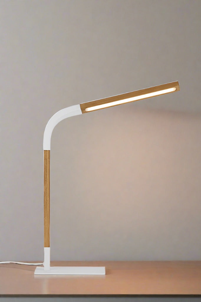 The Heywood Desk Lamp combines style and function with its white finish and wood accent. Its modern Scandinavian styling makes it a versatile choice for all types of decors. Its integrated bulb and adjustable feature makes it ideal for task lighting in a study or office.