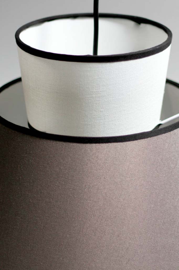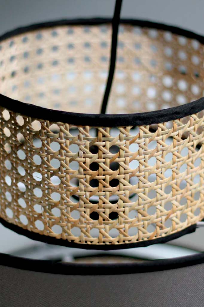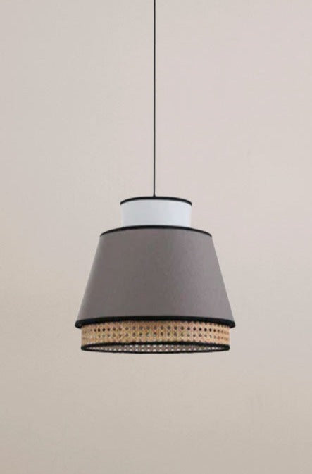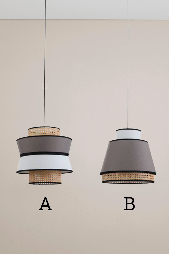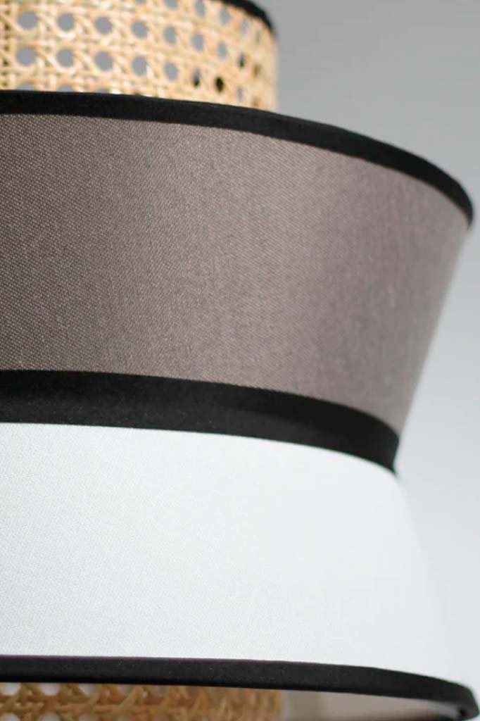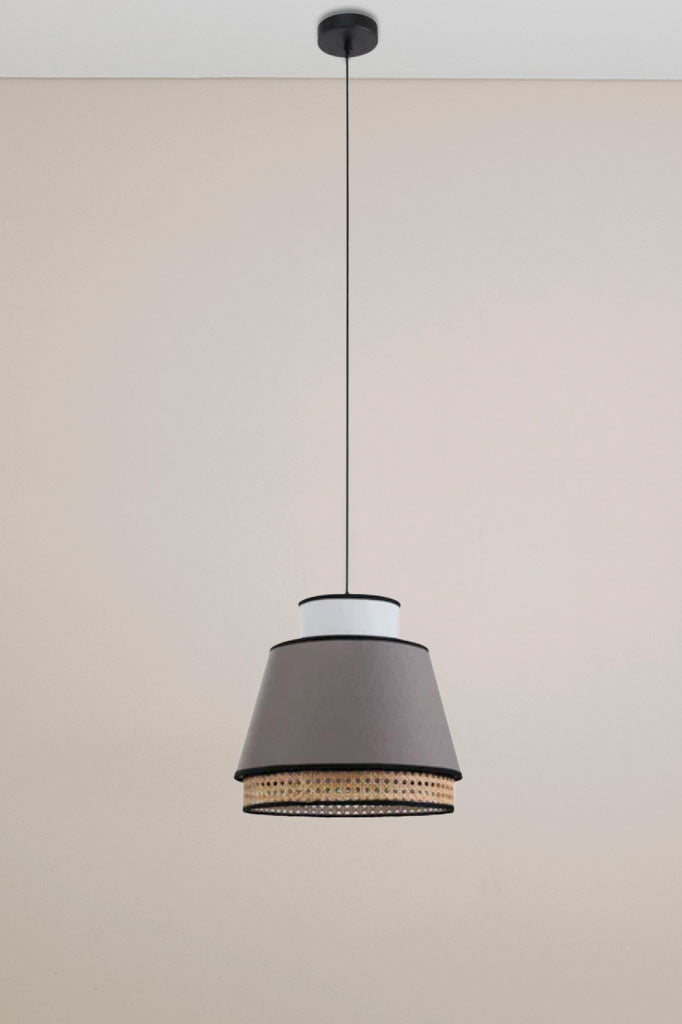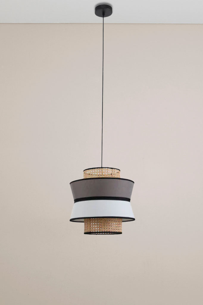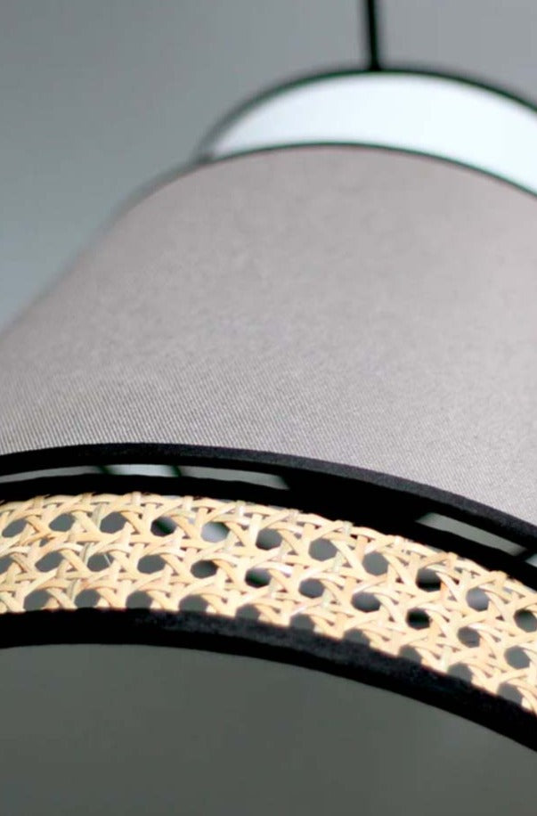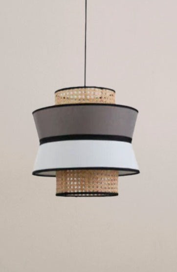 - This pendant light features a white and grey linen shade, complemented by an intricately woven rattan shade with black trim accents.