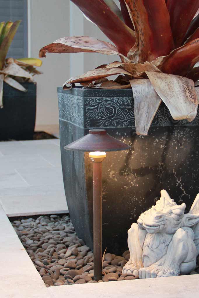 - 12V hooded pathway light with a clear glass diffuser in black or raw copper