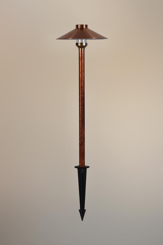 Enhance your outdoors with the Low Voltage Hooded DIY Garden Spike Light. This tall 12volt garden spike features a hooded top with a clear glass diffuser. Constructed from either metal or raw copper. The raw copper has a natural appearance with its surface developing a natural patina over time, making each light unique and known for its excellent corrosion resistance. Making it perfect for garden beds, pathways, and more.