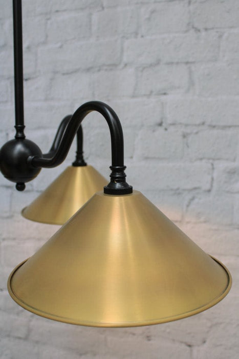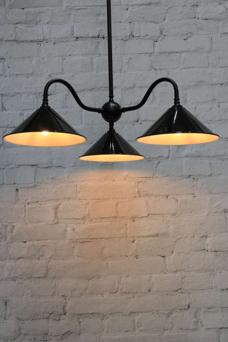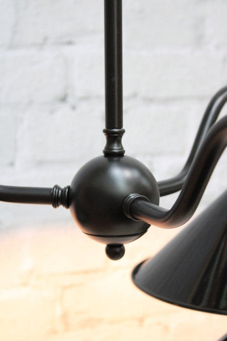 The Industrial Gooseneck Cone Chandelier is a classic statement of industrial design. The fixture is constructed from high quality steel in a black 3 or 5 arm finish, or gold/brass in a 3 arm finish, while the shades are available in eight different steel, copper, and brass finishes. The industrial styling is versatile, fitting perfectly in a similarly styled room or working as a standout centrepiece in an otherwise modern interior. Popular décor uses include accenting above dining tables and kitchen benches or using them in hallways. Ideal for country pubs, urban eateries or industrial breweries.