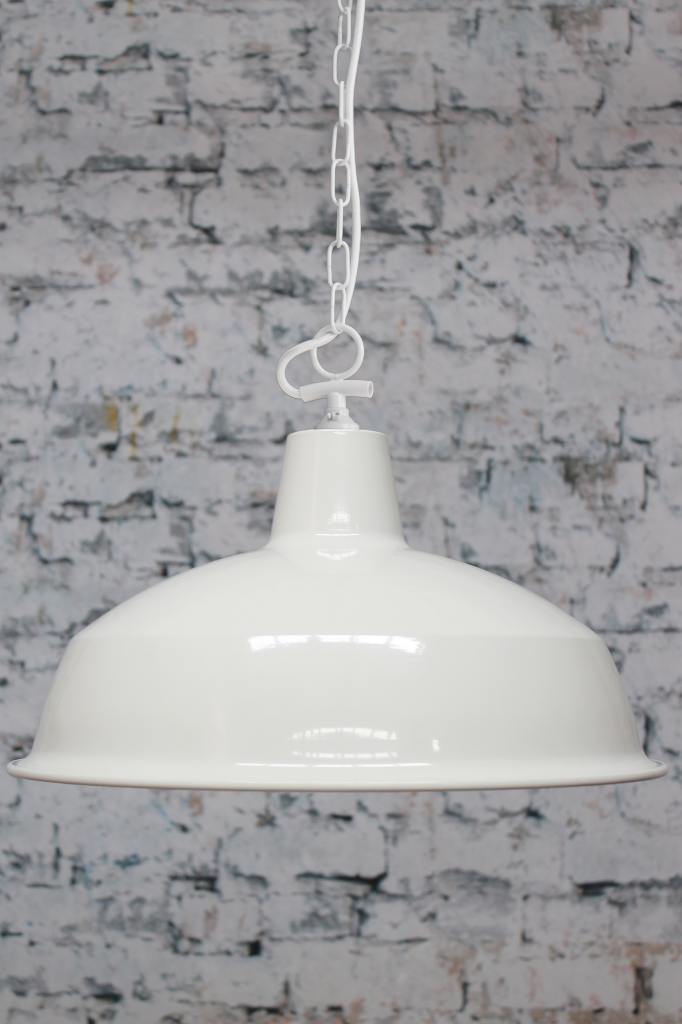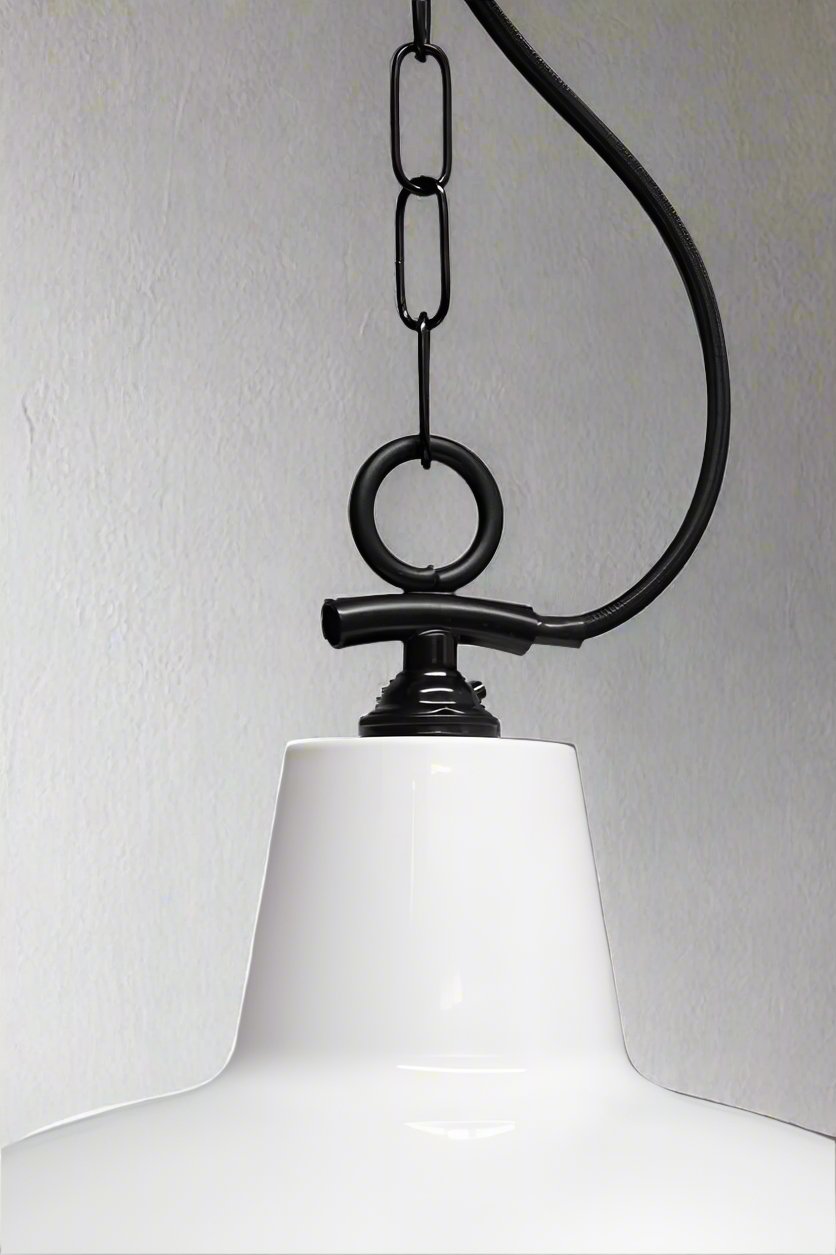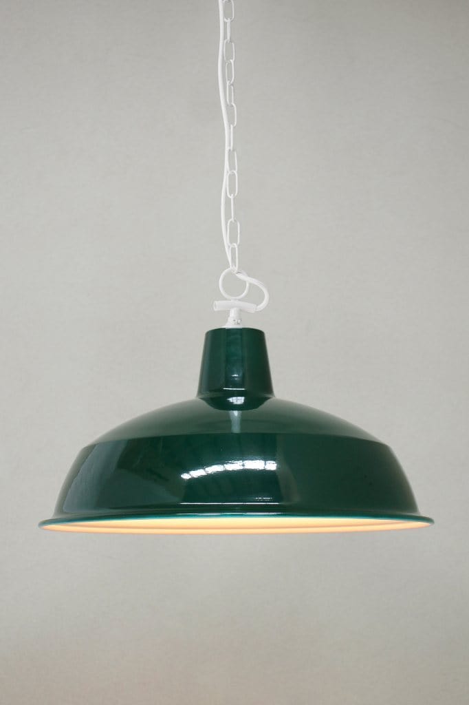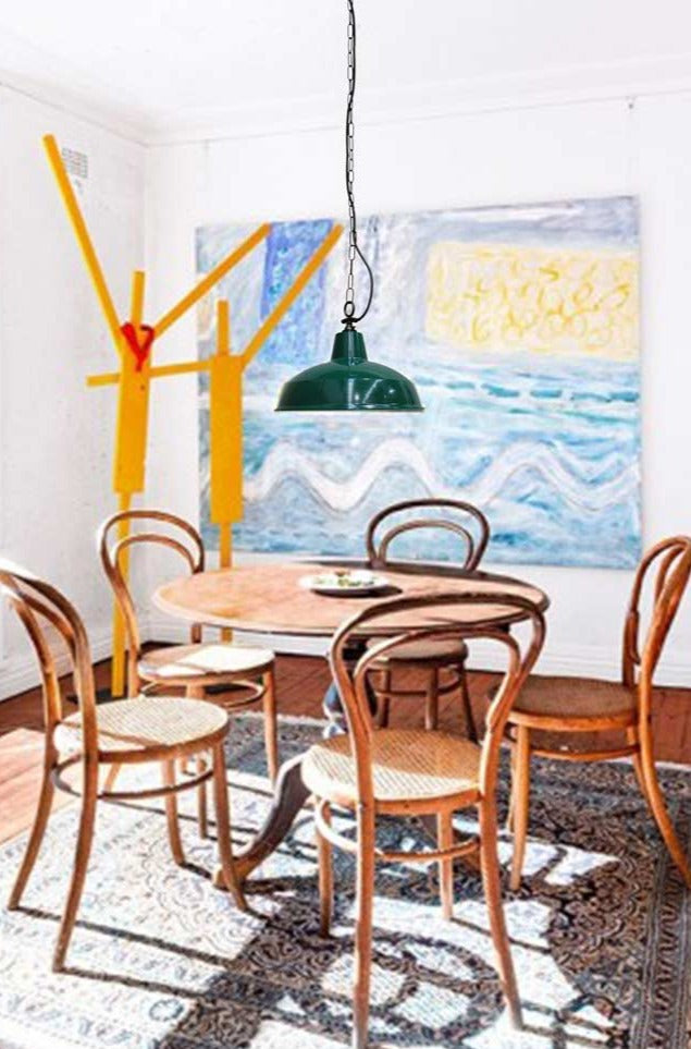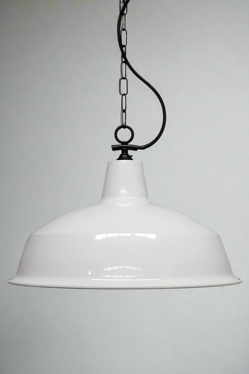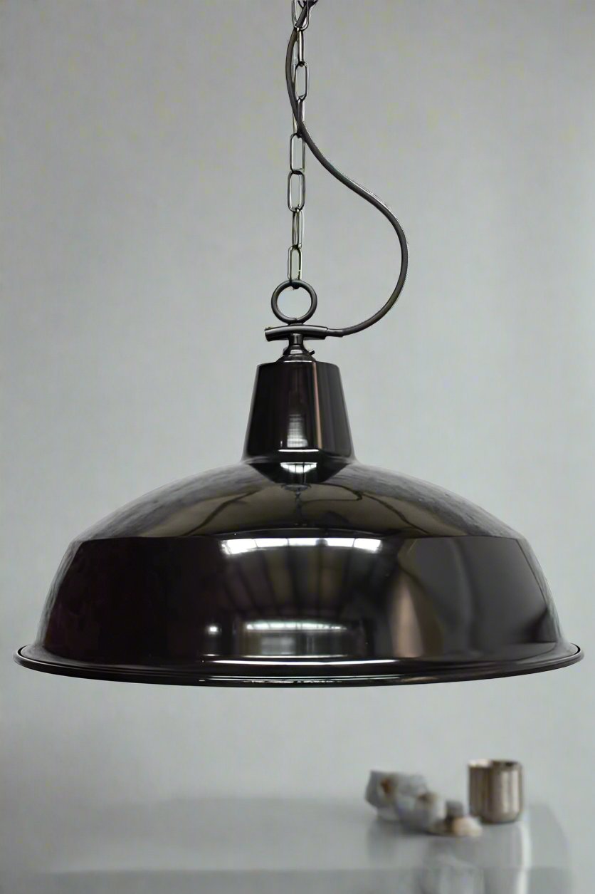 The Industrial Warehouse Side Entry Chain Pendant Light features a classic warehouse shade and side chain suspension in two finishes. The classic warehouse shades are available in different sizes and materials to match your decor. Perfect for entryways, living and dining rooms, or over kitchen islands.