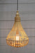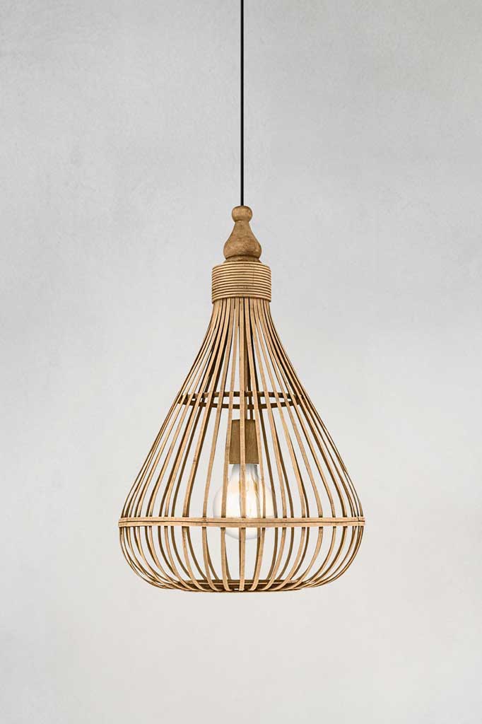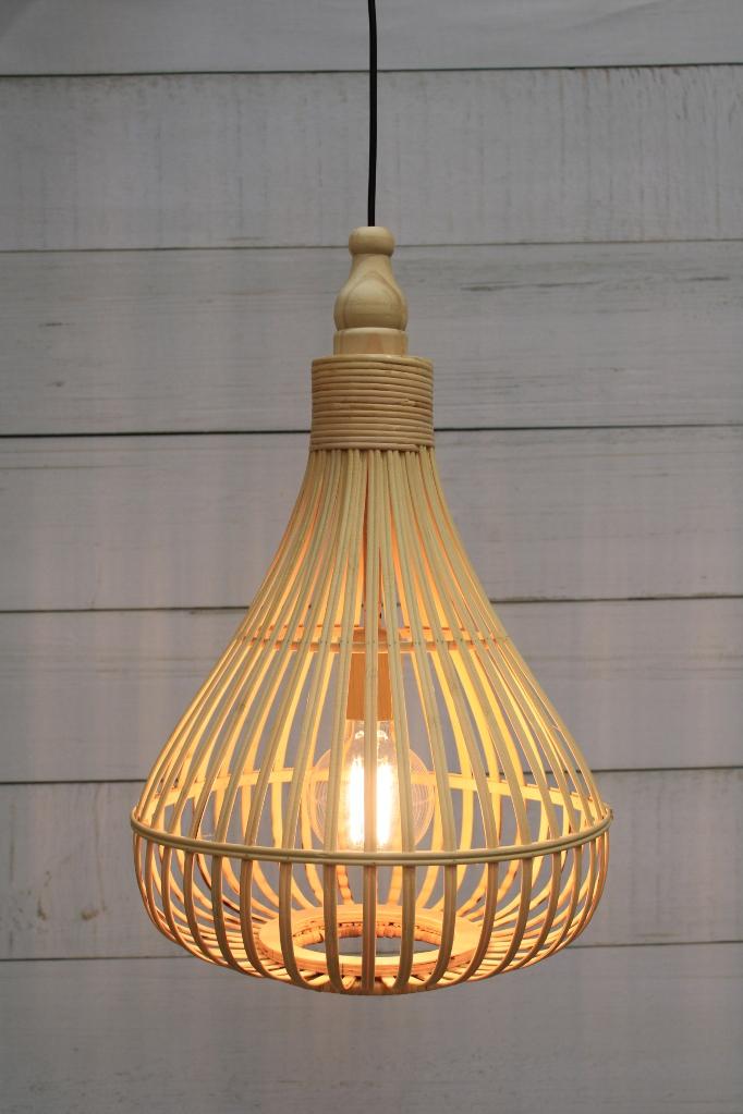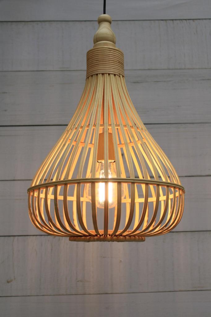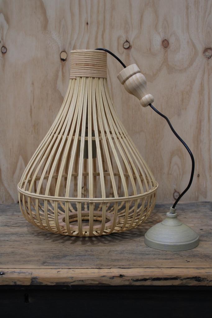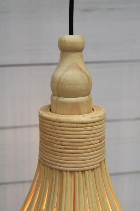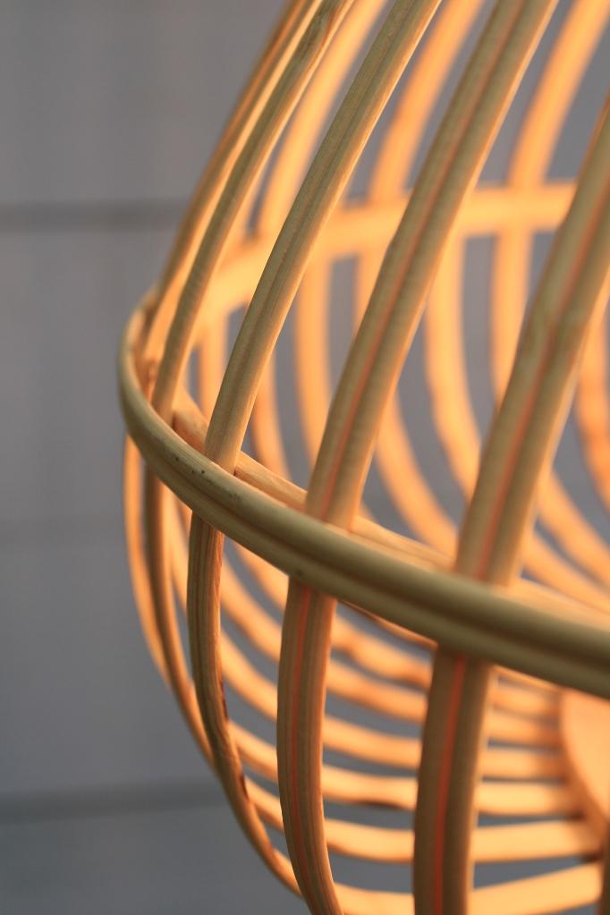 - Its wicker shade is woven from light wood with a natural cane finish.