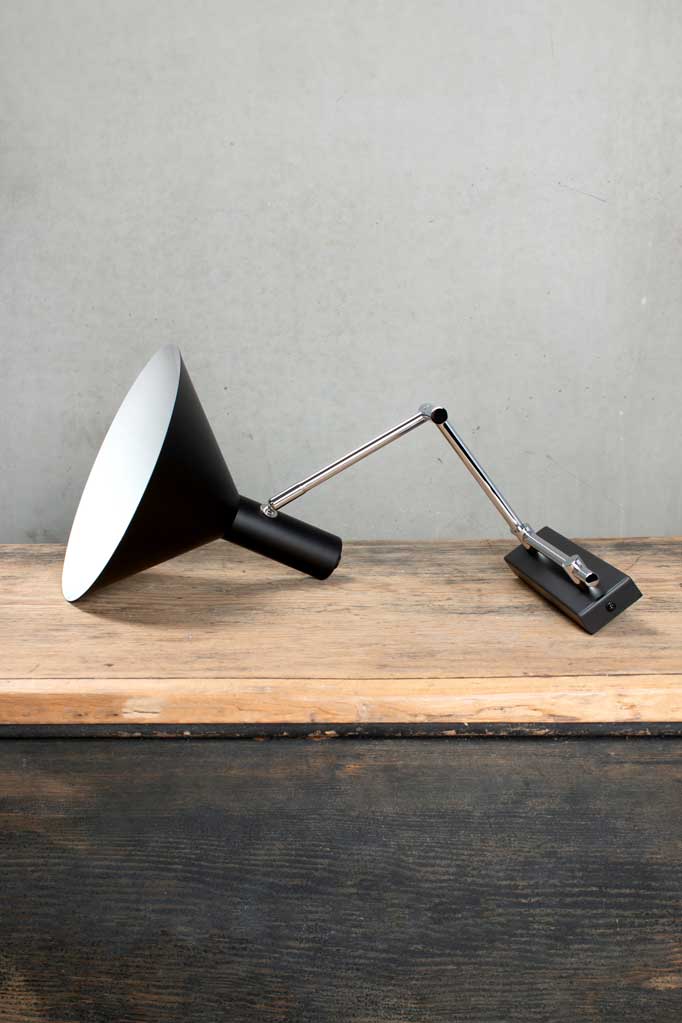 - It is constructed from steel and features a distinguishable large black funnel shade and chrome arm perfect for serving as a task light.