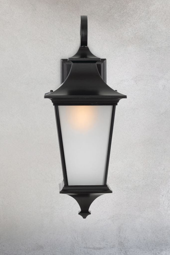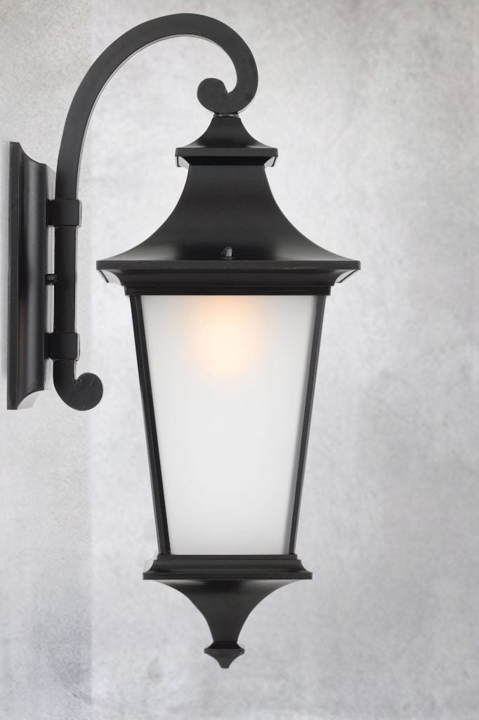 A modern interpretation of the Victorian gas street lamp, the Irving Outdoor Wall Light exudes traditional charm. Acid frosted glass offers diffuse light and a distinct contrast to the black powder-coated finish of the lamp, providing a classic look that will complement any exterior. Place this wall light at your entrance or along your verandah to add vintage ambience. Commercially, this wall light could be used to illuminate the entrance to a heritage hotel or add charm to a covered outdoor dining space.