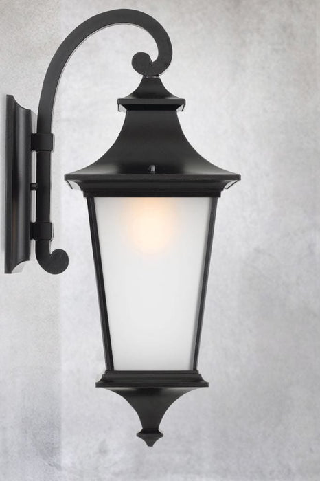 - This wall light is comprised of a black metal powder-coated body with acid frosted glass.