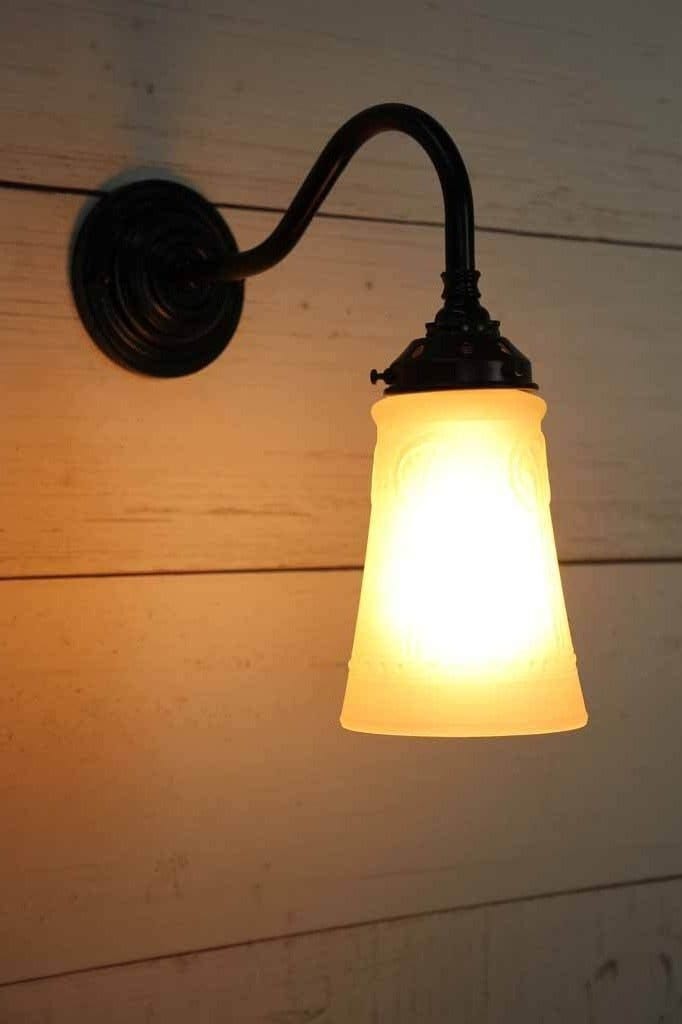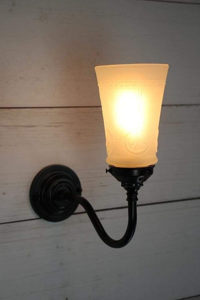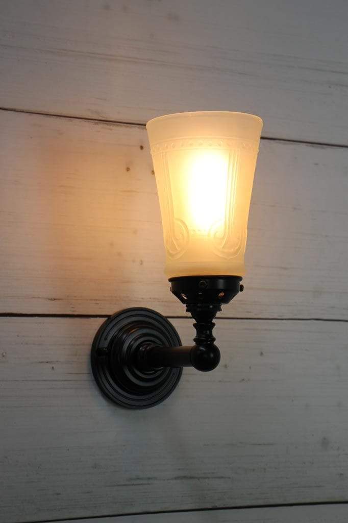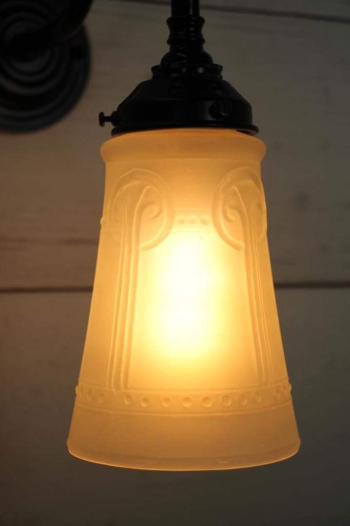 - The glass shade is mounted on a high quality brass or steel wall sconce.