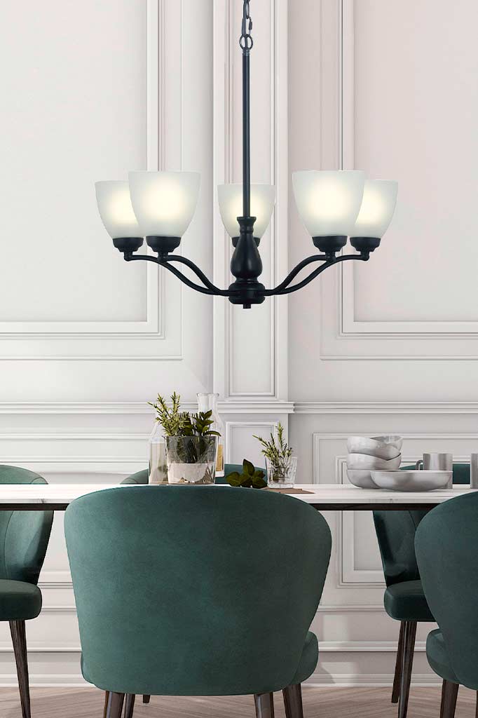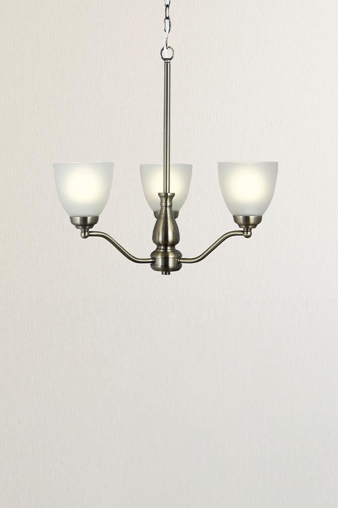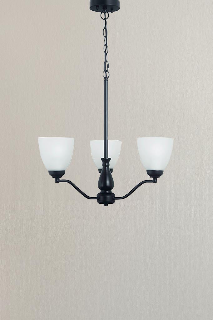The Kensington Glass Chandelier adds classical elegance to your space. Curved metal arms in two finishes hold the frosted glass shades. Supported by a central suspension rod. This chandelier is available in two sizes and styles, and adds a traditional aesthetic to your dining room, bedroom or lounge. Commercially, this light would suit an elegant bridal salon, Hamptons style lodge or sophisticated tea room.