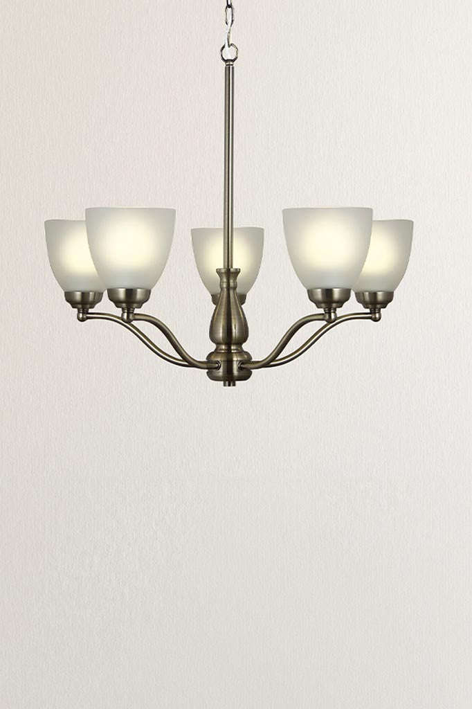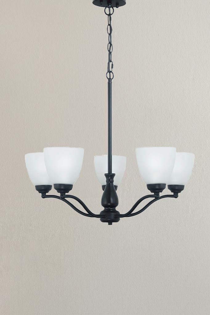 - This chandelier is comprised of a metal frame finished in antique brass or black, frosted glass shades and a metal suspension rod.